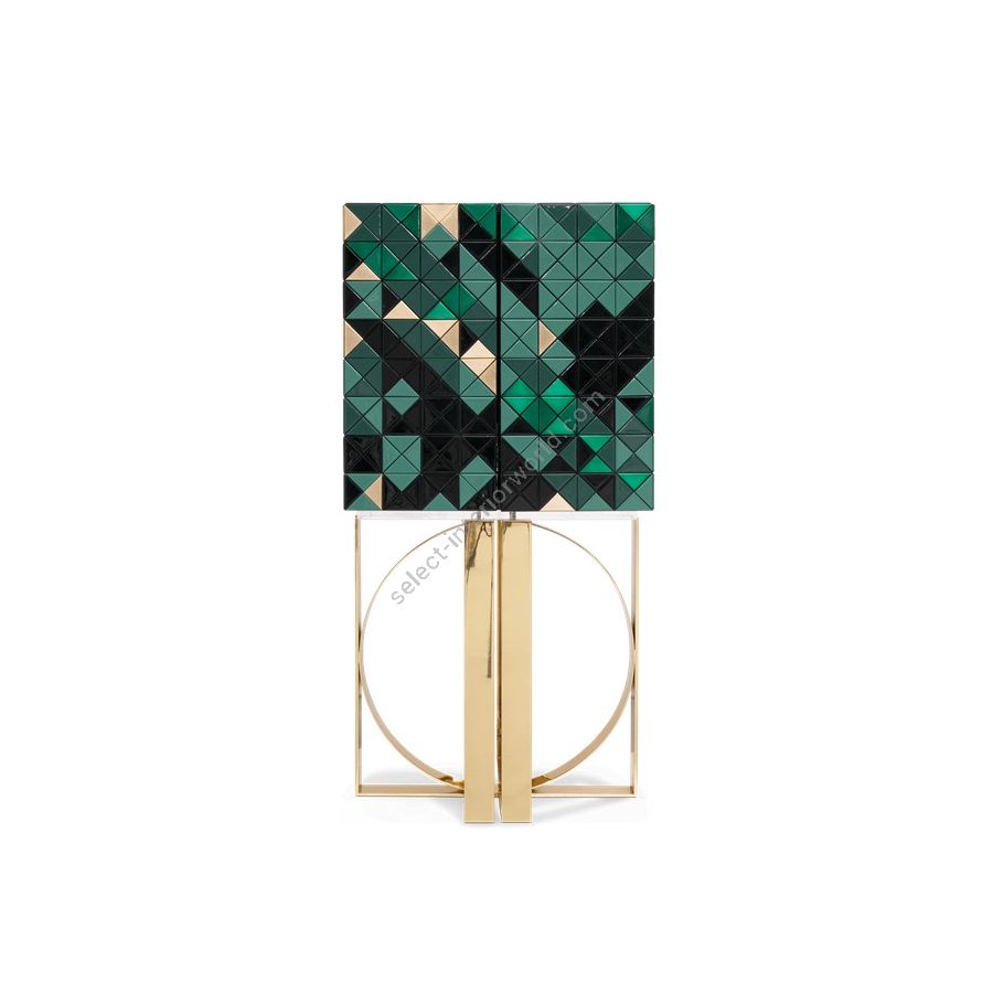 Made out of 1088 triangles, the upper part of the Pixel Cabinet plays with perception and combines exceptional materials with multicolored compositions to give the cabinet a unique, striking design: handmade leaf gilding triangles, 10 different types of wood leafs from palisander to African walnut veneer, and lacquering. Behind its two doors, this bar cabinet surprises with a timeless combination of aged mirror and a diamond quilted blue silk fabric, containing nine interior drawers, each one with its own golden knob. The polished brass base gives Pixel a unique and sophisticated character.