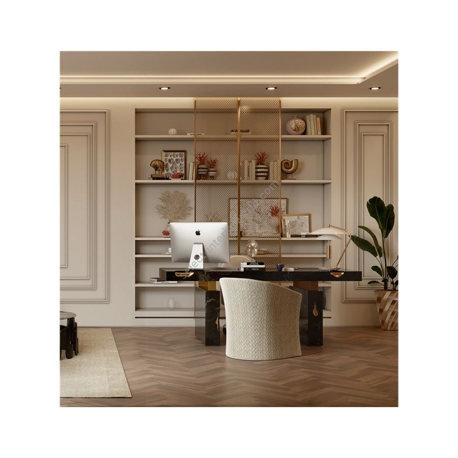 An elegant writing desk built in marble with polished brass details. Its cracks are hand-carved and inserted through polished brass sheets, which are hand-hammered for a unique finish.