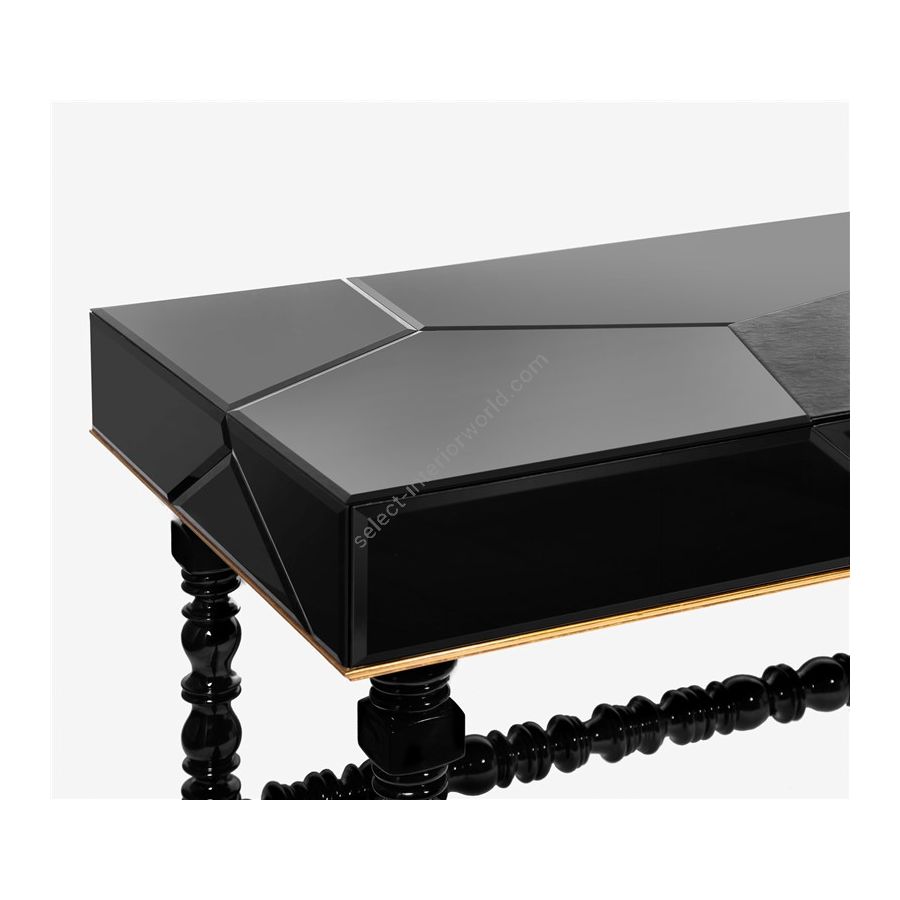 The exquisite Coolors Collection by Boca do Lobo blends sophistication and modern refinement into elegant decorative furniture designs like the Manu writing desk. A furniture piece inspired by the traditional Portuguese secretary of the 16th. Influenced by Manueline style, this black desk is ideal for a classic office or a romantic bedroom. The top is lined with a black lacquered mirror, and the work area is made of leather. The base is turned and lacquered finished with a high gloss varnish. The modern desk Contains three drawers and gold leaf detail.