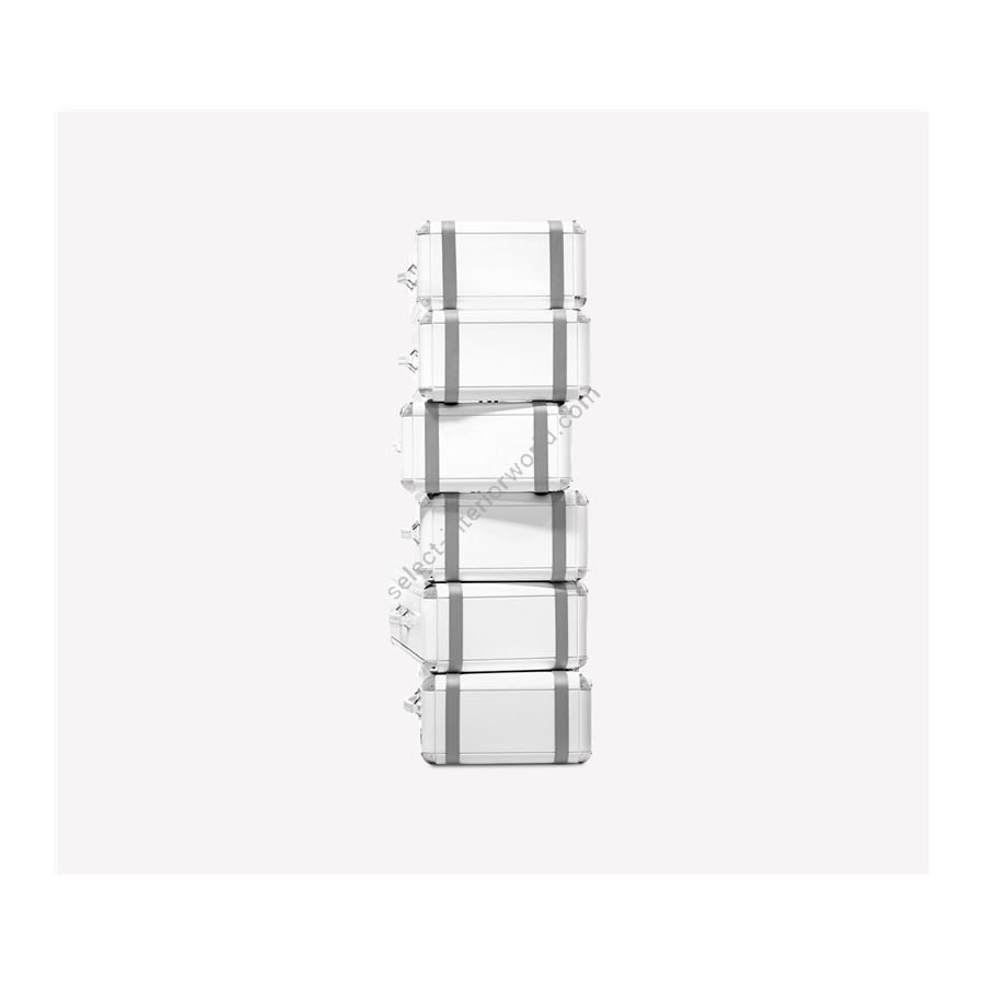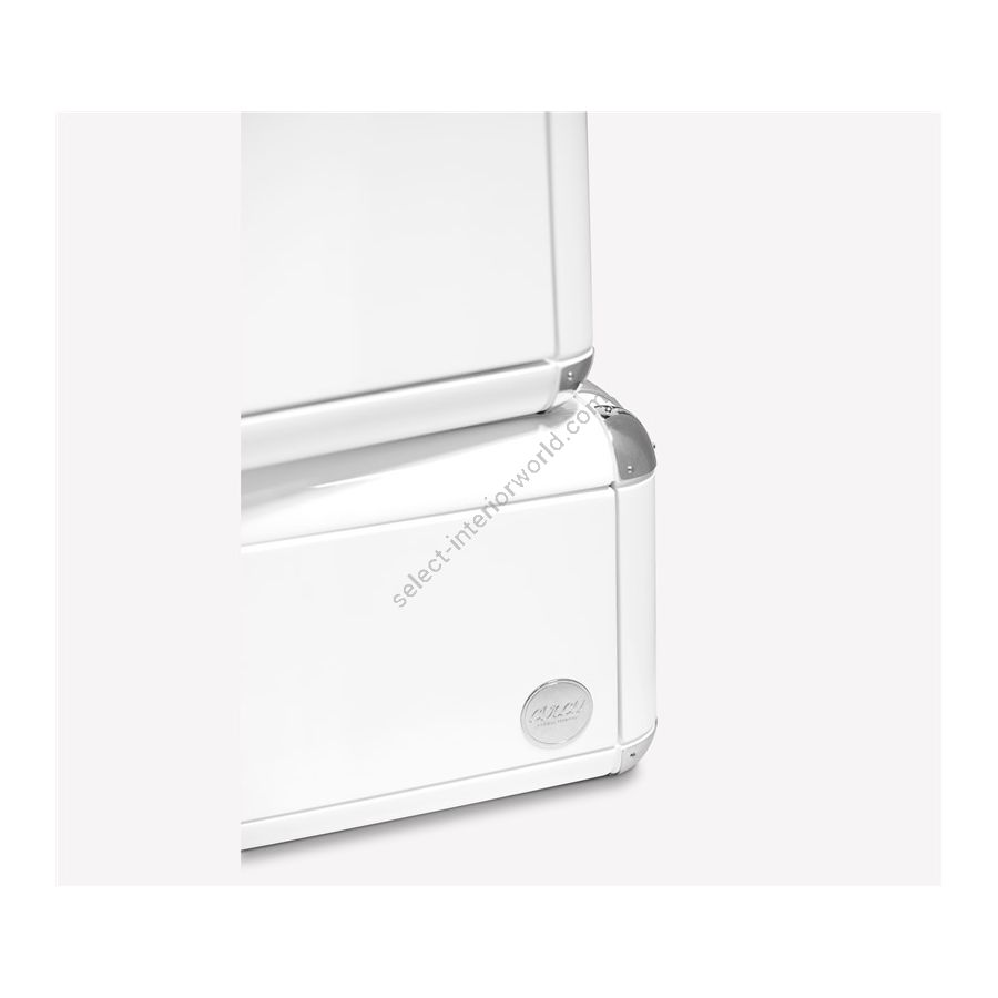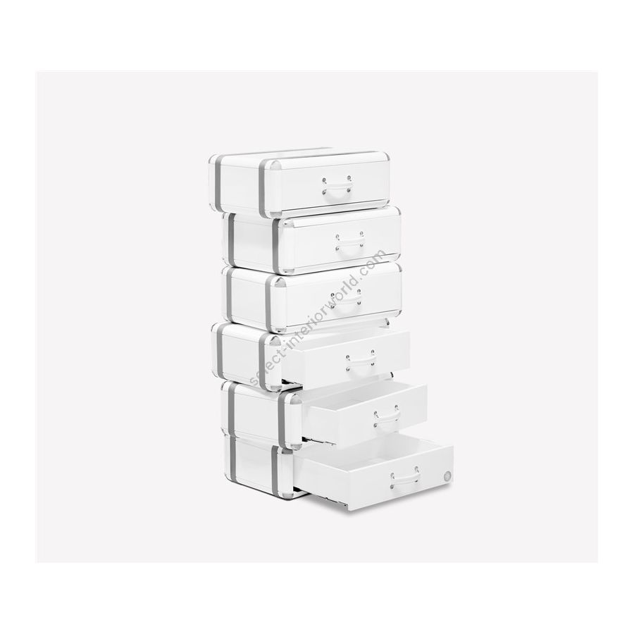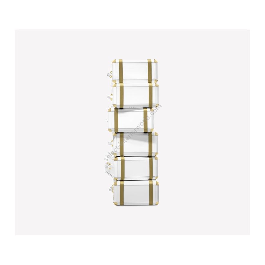 Lacquered in glossy white, Metal parts in gold plated finishing, Strips in gold synthetic leather or Lacquered in glossy white, Metal parts in Nickel Plated finishing, Strips in Grey synthetic leather