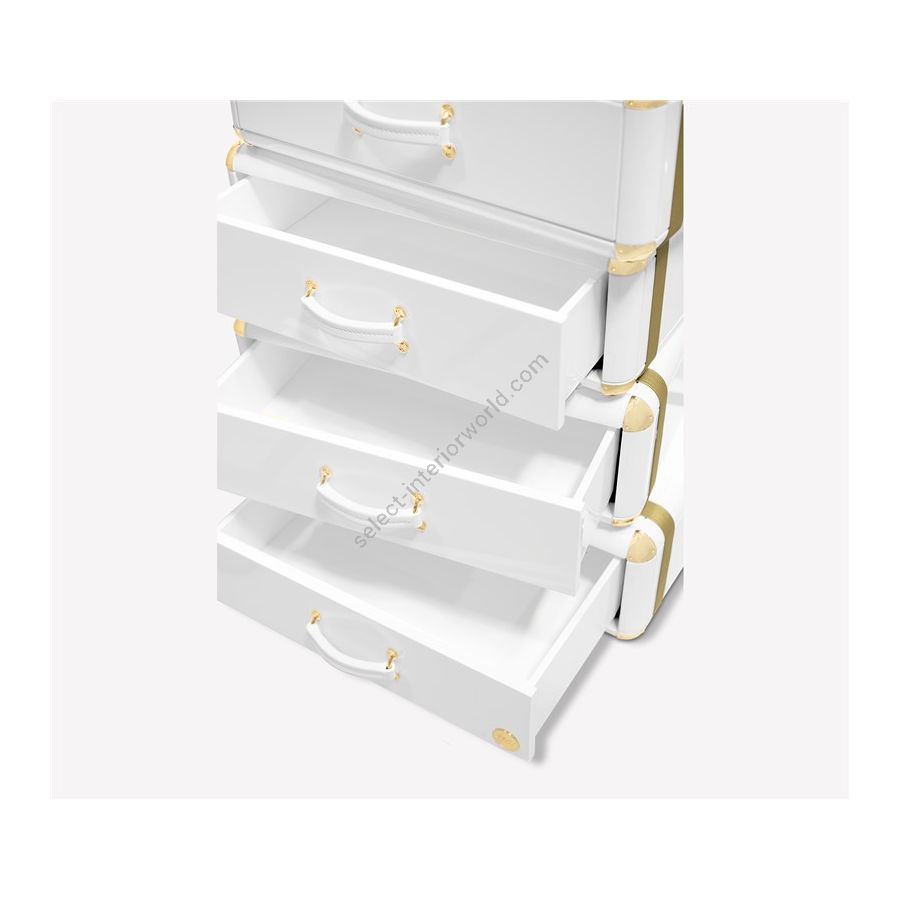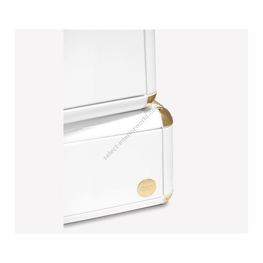 Built-in wood, lacquered in glossy white, with details in synthetic leather and gold plated finishes.