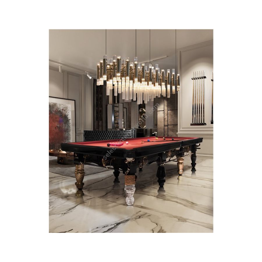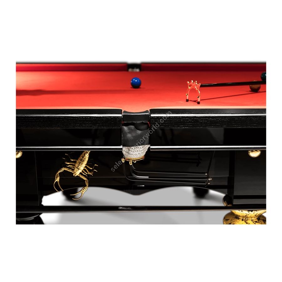 A playful and remarkable design imagined for those who appreciate the good things in life, finding beauty in the most unexpected places. An extraordinary English snooker table of 10 foot playground, founded by 8 statement designed black wood legs which portray unexpected chaos of high-end materials and unexpected casted brass black bugs and gold scorpions, for an emotional experience. With renowned Ronnie O’Sullivan cues with 9mm of diameter and a professional snooker kit, this contemporary snooker table certainly challenges the boundaries of game rooms and present day-luxe. A tribute to the darkest side of nature where challenges never seize to exist.