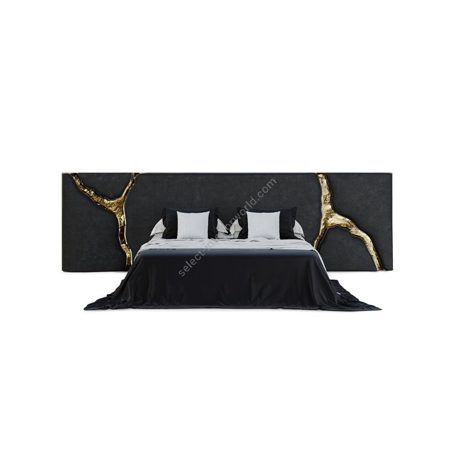 Lapiaz headboard takes exceptional craftsmanship and contemporary design to a new realm. The organic features of this upholstered headboard are achieved through the manual fitting of gold-polished brass into the velvet structure. A platform bed can be added under request and it can accommodate a range of mattress types.