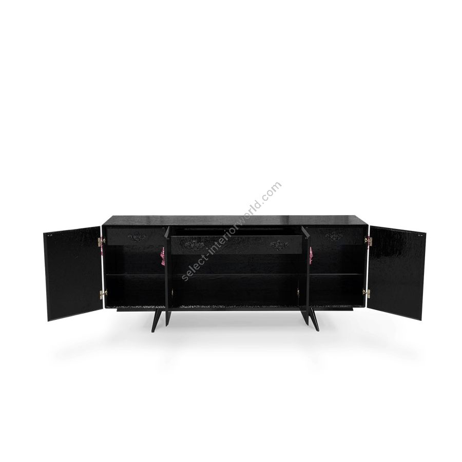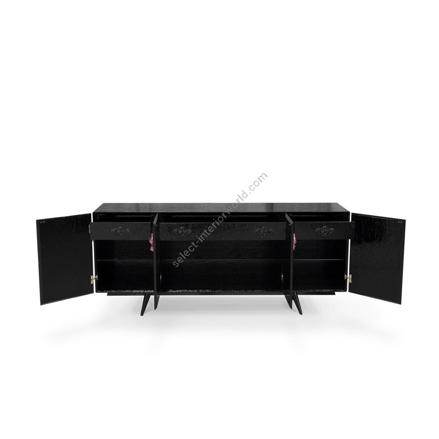Sideboard handcrafted in wood lacquered in black with a high gloss varnish. With four doors, in its interior you find two drawers and four shelves. In its exterior, the floral garland is made from handcrafted wood finished with a high gloss varnish translucent color over silver leaf in amethyst.