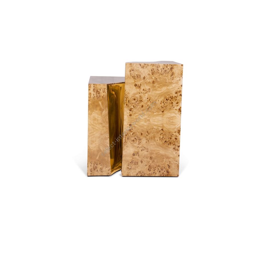 Its organic features are achieved through the manual fitting of the polished brass sheet, and a sharp exterior finished in polished stainless steel that portrays a perfect mirror. The hammered brass details and mirrored sides convey both dynamics and elegance, a beautiful duality between power and refinement to bring a new contemporary verve into interior design.