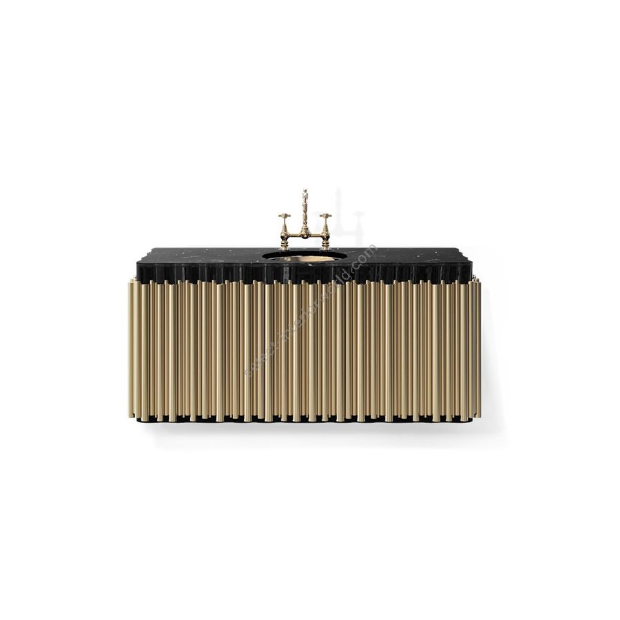 Structure: Wood, High Gloss Black Lacquered; External Structure: Gold Plated Brass Tubes, High Gloss Varnish; Top: Nero Marquina Marble; Sink: Polished Brass, High Gloss Varnish; Water drainage: Wall