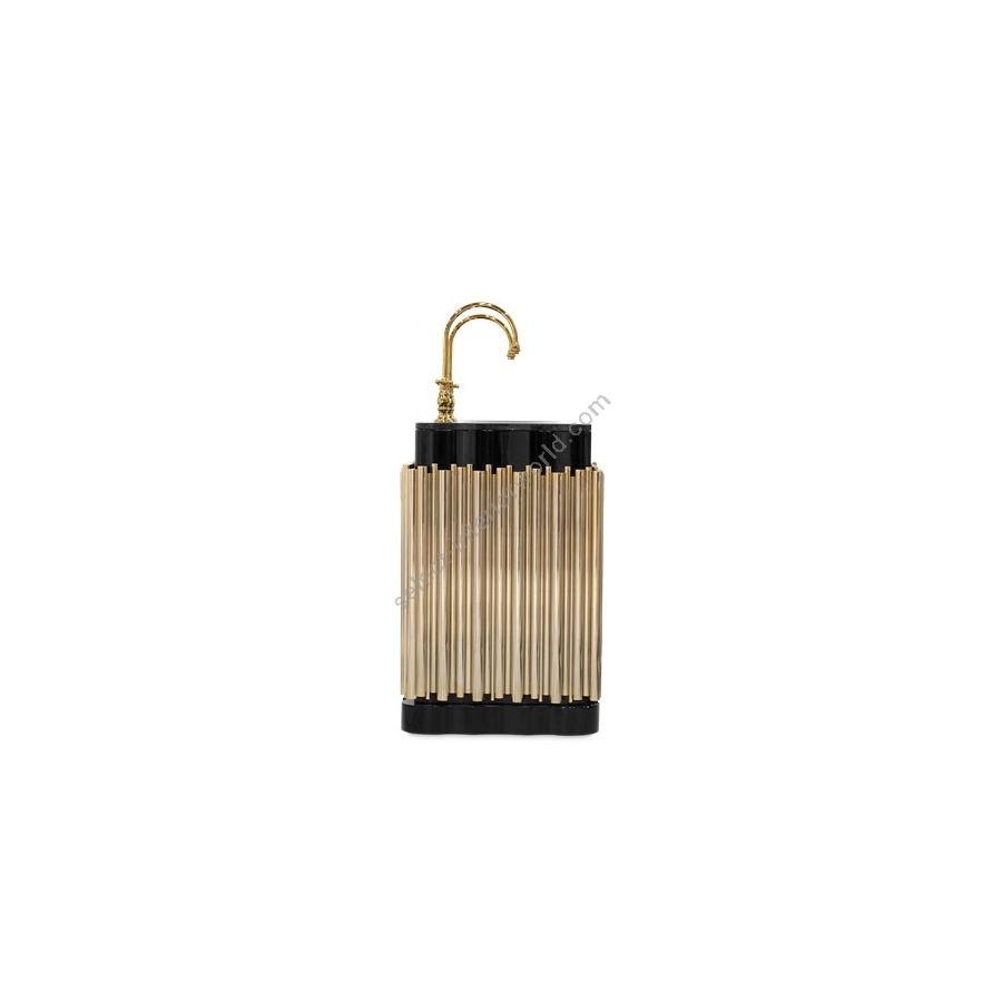 Structure: Wood, High Gloss black lacquered | Gold plated brass tubes, High gloss varnish; Top: Nero Marquina marble; Sink: Polished Brass, High Gloss Varnish; Water drainage: Wall