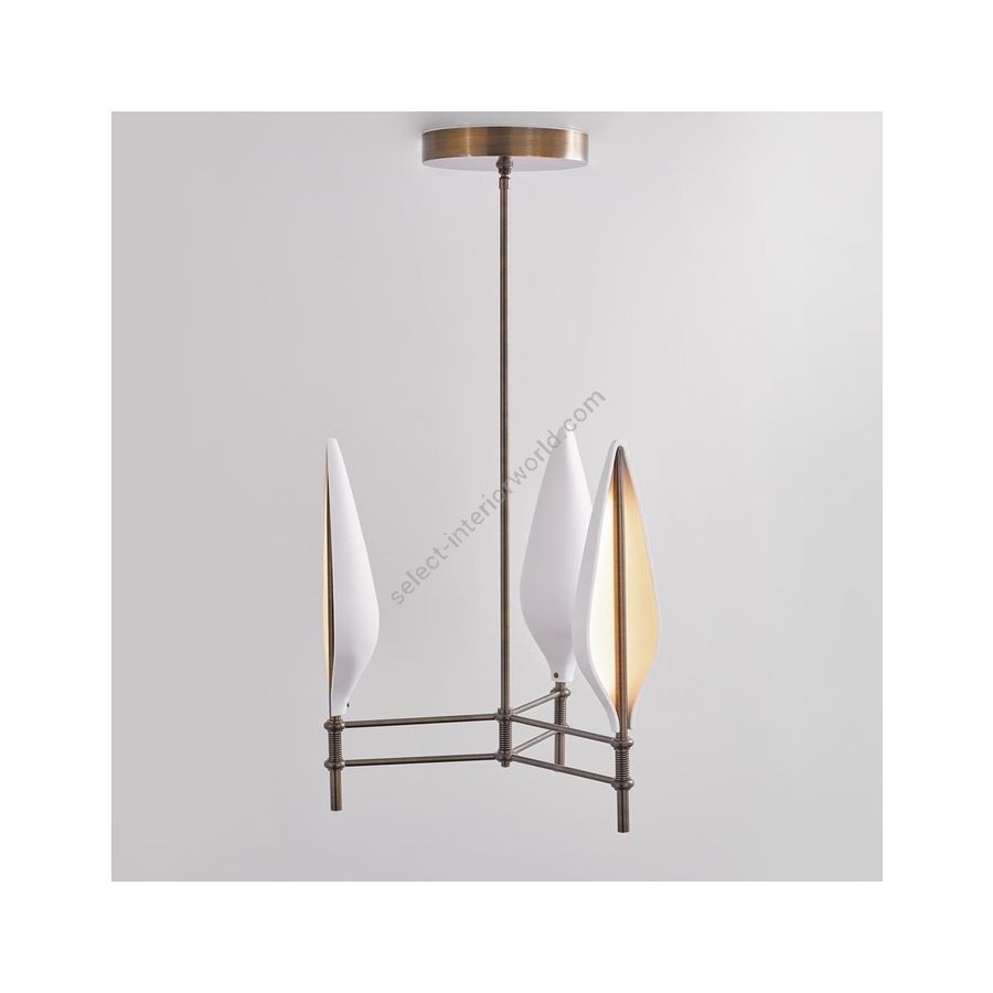 Architectural details inspired the Spire Pendant, which features three cast porcelain shades, each illuminated from within turned brass rods to create a sculptural statement piece. Designed by Jake Oliveira.