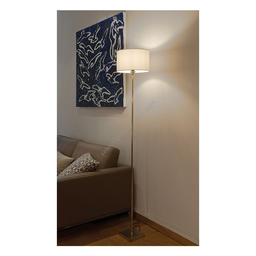 Floor lamp in brass. Made with a round tube on a square base. This sober and elegant floor lamp remains discrete in your interior. Available in black or matt gold patina, and in nickel or brushed nickel. Also exists in small size (LD12). Presented lamp shade in white cotton chintz in a conical shape (see other available shapes and colours).