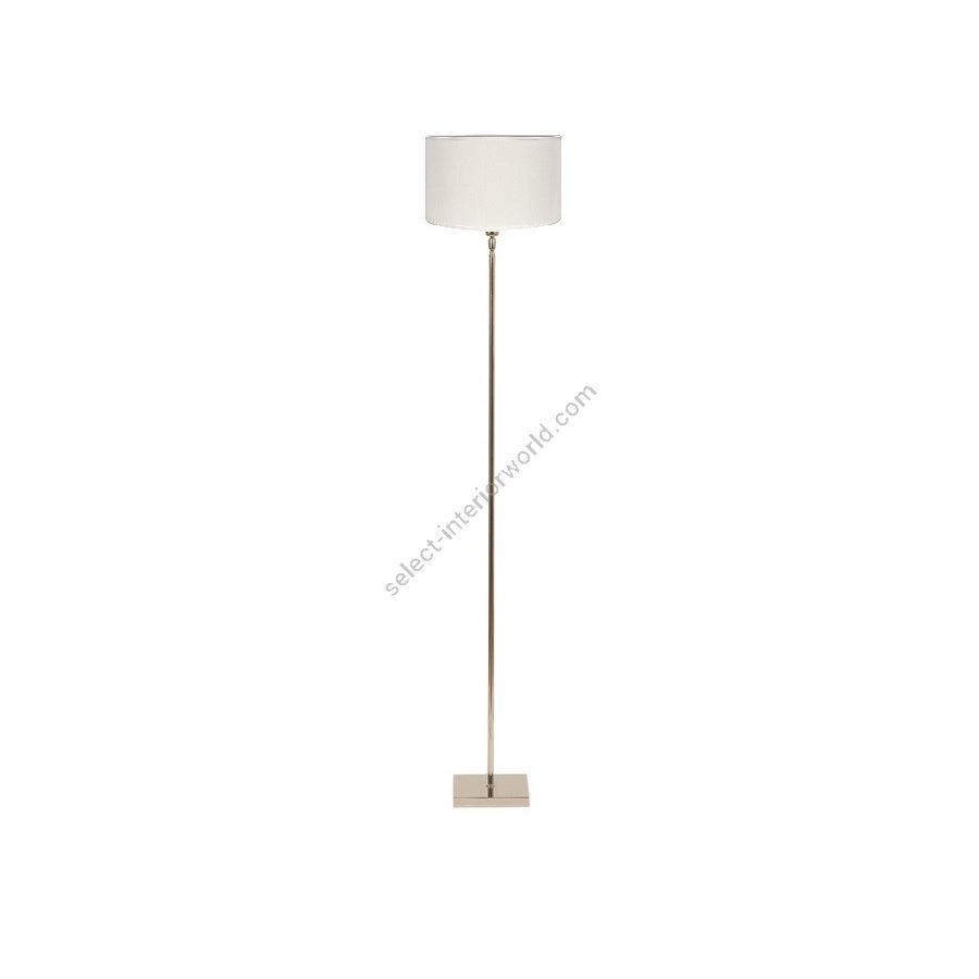 Floor lamp in brass. Made with a round tube on a square base. This sober and elegant floor lamp remains discrete in your interior. Available in black or matt gold patina, and in nickel or brushed nickel. Also exists in large size (LD11). Presented lamp shade in white cotton chintz in a cylindrical shape (see other available shapes and colours).