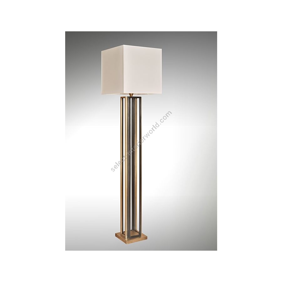 Floor lamp made in brass. It is made with four sides, each with bicolor layered rectangles, on a square base. This floor lamp, which is definitely contemporary and represents a wonderful sculpture work, magnificently decorates your interior. AVailable in bicolor black and matt gold patina. Presented floor lamp shade in white cotton chintz in a square shape (see other available clours).
