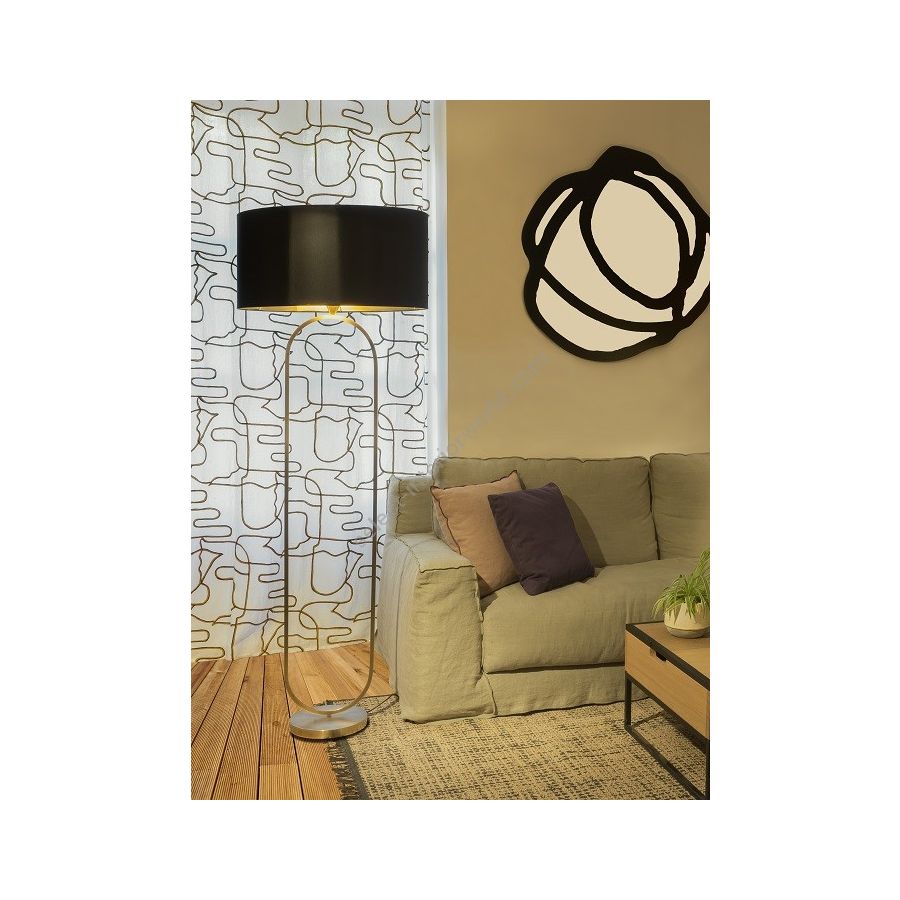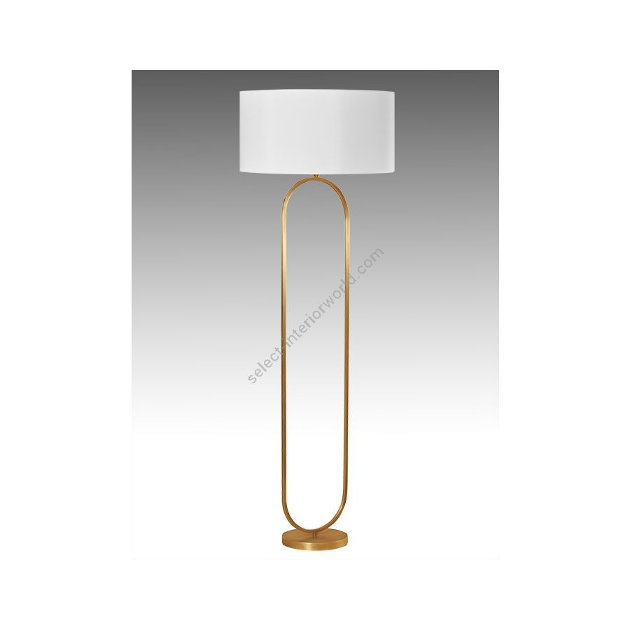 Floor lamp made in brass It is made with a square tube forming an harmonious oval on a round base This floor lamp with an elegant design nicely decorates a living room, a bedroom or an office Available in black or matt gold patina Presented cylindrical shade in white cream chintz (see other available colors).