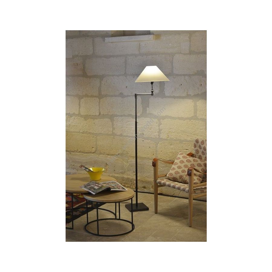 Floor lamp in brass. Made with a ajustable round tube with a swing arm, on a square base. This contemporaryl floor lamp gives a deported lighting thanks to its adjustable tube and its swing arm. Available in black or matt gold patina. Presented lamp shade in white cotton chintz in a conical shape (see other available shapes and colours).