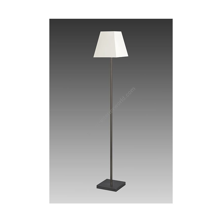 Floor lamp in brass. Made with a square tube on a square base. This sober and elegant floor lamp remains discrete in your interior. Available in black or matt gold patina. Also exists in medium (LD58B) or large size (LD58C). Presented lamp shade in white cotton chintz in a pyramidal tapered shape (see other available shapes and colours).