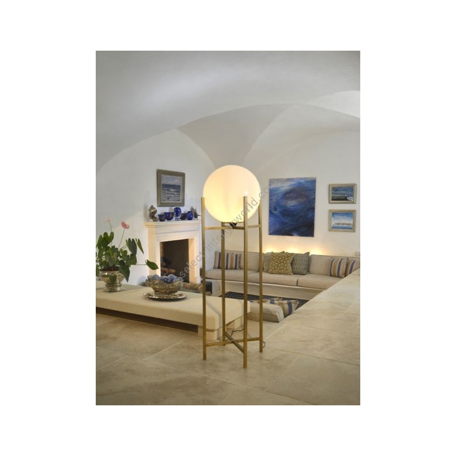 Floor lamp in brass. Made with 4 vertical square tubes, joined in their middle by 2 crossed tubes. This contemporary floor lamp gives an original design to your interior. Available in black or matt gold patina. White glass globe (supplied).