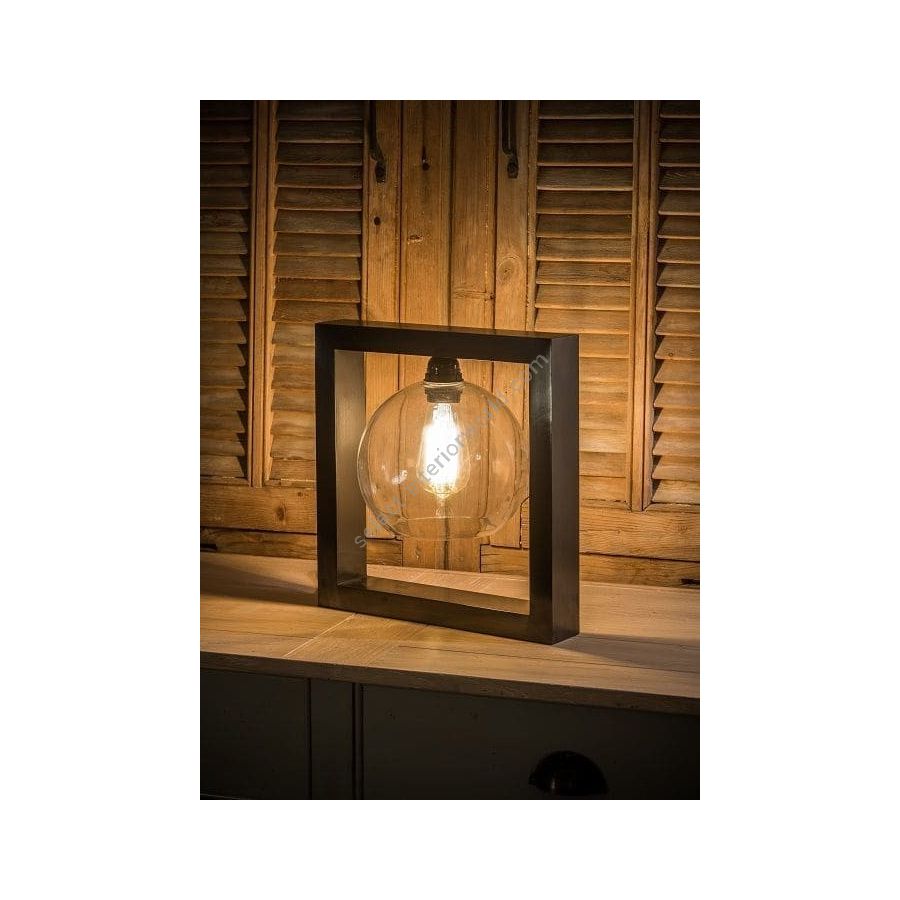 Lamp made in brass. Made with rectangular tubes representing a rectangular frame. An oval glass globe in fixed inside (supplied). Also exists with horizontal fixing (L165H). Lighting is made with a filament bulb. This contemporary lamp gives an original design to your interior. Available in black patina