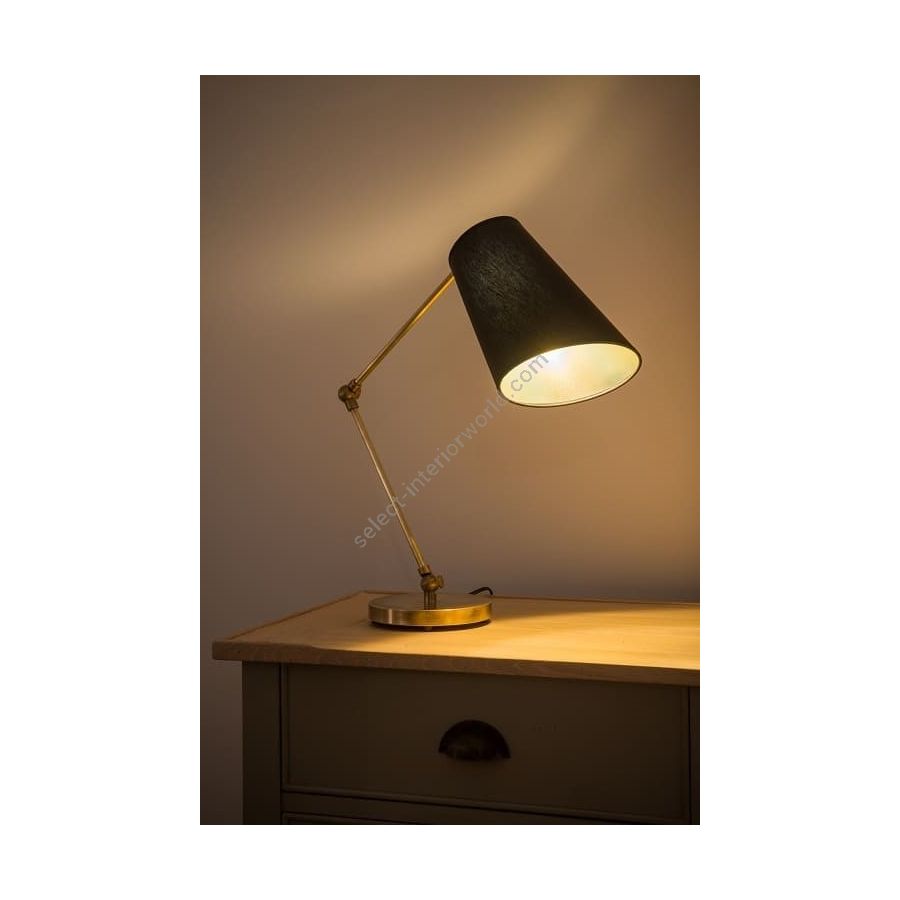Lamp made in brass. Made with a double swing round tube on a round base. This lamp with an original design gives a changing light thanks to its swing arm. Available in black or matt gold patina. Presented lamp shade in black chintz with gold inside in a conical shape (see other available shapes and colours)