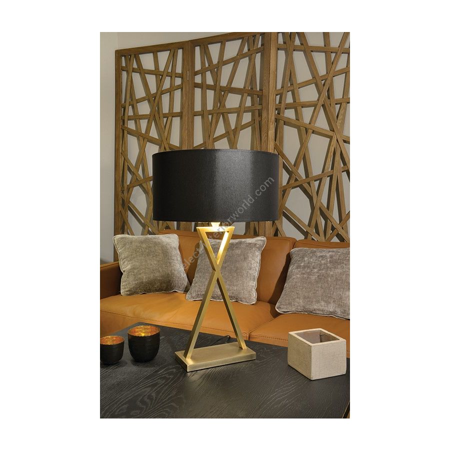 Table lamp made in brass. Made with 2 rectangular tubes making a triangle on a rectangular base. This table lamp with an original and elegant geometric design will bring a touch of modernism to your interior. Available in black or matt gold patina. This model is also available in floor lamp (LD96) and in wall light (AL196). Presented lamp shade in white cream chintz in a cylindrical shape (see other available shapes and colours)