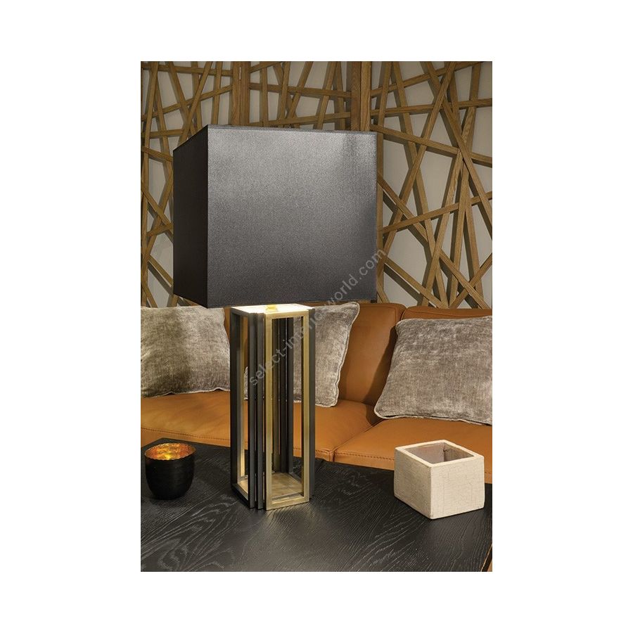 Table lamp made in brass. It is made with 4 sides, each with bicolor layered rectangles. This lamp, which is definitely contemporary and represents a wonderful sculpture work, magnificently decorates your interior. AVailable in bicolor black and matt gold patina. Presented lamp shade in white cotton chintz in a square shape (see other shapes and other available colours)
