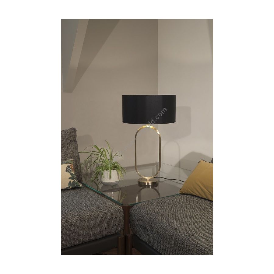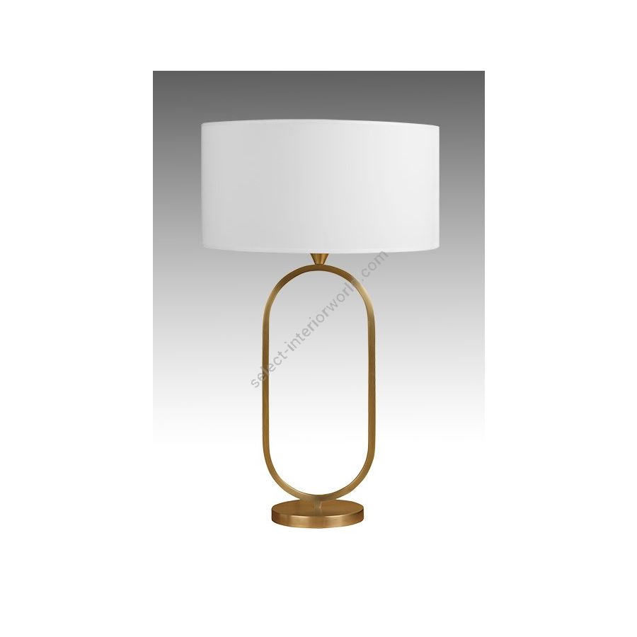 Table lamp made in brass It is made with a square tube forming an harmonious oval on a round base This lamp with an elegant design nicely decorates a living room, a bedroom or an office Available in black or matt gold patina Also available in smaller size (L203A) Presented cylindrical shade in white cream chintz (see other available colors)
