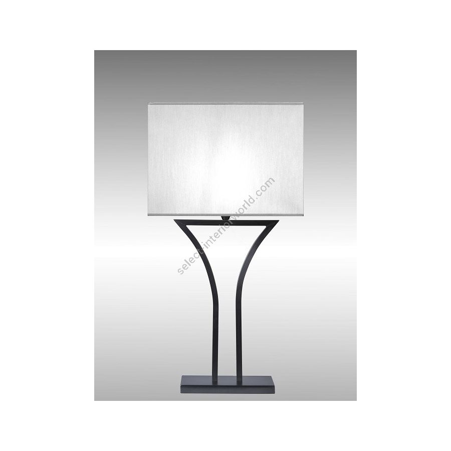 Lamp made in brass It is made with two square tubes forming harmonious curbs, on a rectangular base This table lamp with an elegant design nicely decorates a living room, a bedroom or an office Available in black or matt gold patina Presented rectangular shade in white cream chintz (see other available shapes and colors)