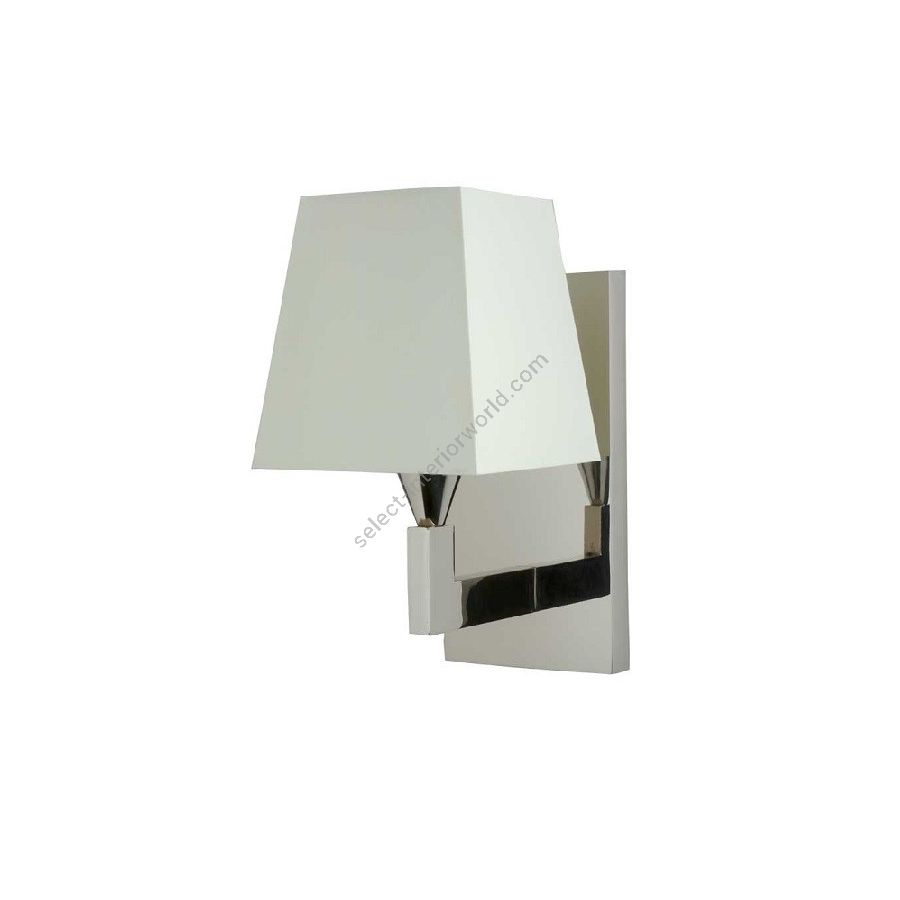 Wall light made in brass. Made with a fixed arm on a large rectangular base. This simple and elegant wall light discretely fits into your interior. Available in black or matt gold patina, and in nickel or brushed nickel. Presented lamp shade in white cotton chintz in a pyramidal shape (see other available shapes and colours).