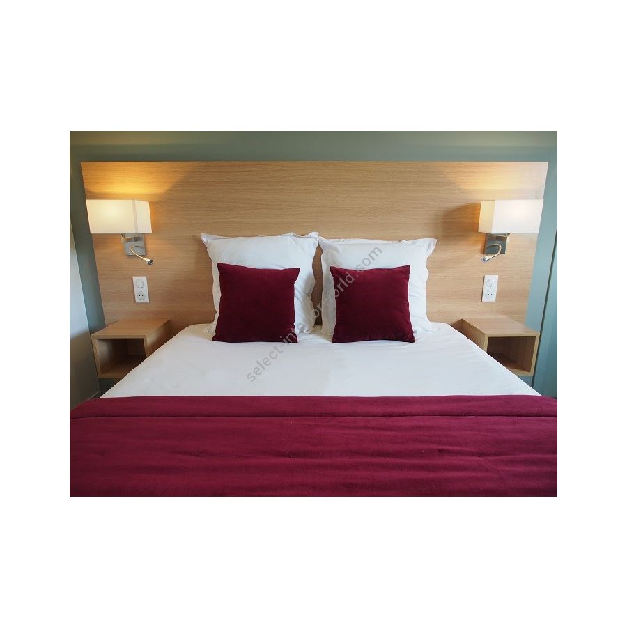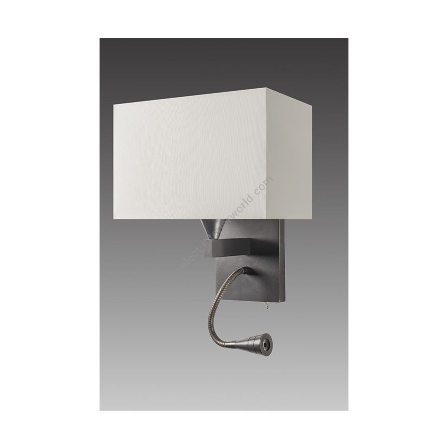 Wall light with Led light made in brass. Made with a fixed arm on a rectangular base and a Led light, on a 20cm flex with switch. This elegant wall light gives an ambiance or direct light. Possibility of a second switch on demand. Available in black or matt gold patina, and in nickel or brushed nickel. Presented lamp shade in white cotton chintz in a rectangular shape (see other available shapes and colours).