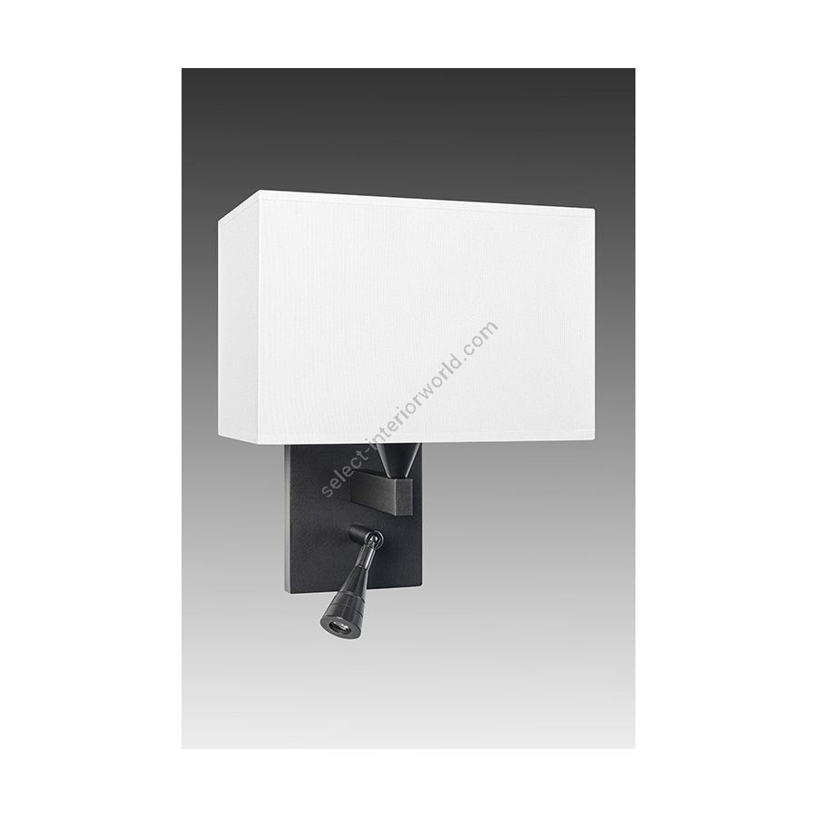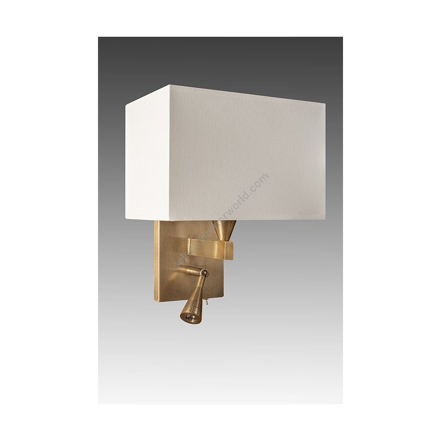 Wall light with Led light made in brass. Made with a fixed arm on a rectangular base and a Led light, on a kneecap with switch. This elegant wall light gives an ambiance or direct light. Possibility of a second switch on demand. Available in black or matt gold patina, and in nickel or brushed nickel. Presented lamp shade in white cotton chintz in a rectangular shape (see other available shapes and colours).