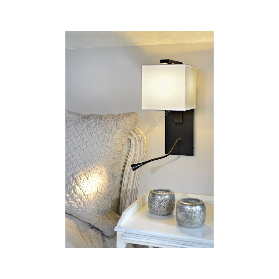 Wall light with Led light made in brass. Made with a vertical curved fixed arm where the lamp shade is suspended, on a rectangular base and a Led light, on a 20cm flex with switch. This elegant wall light next to bed gives an ambiance or direct light. Possibility of a second switch on demand. Available in black patina. Presented lamp shade in white cotton chintz in a square shape (see other available shapes and colours)