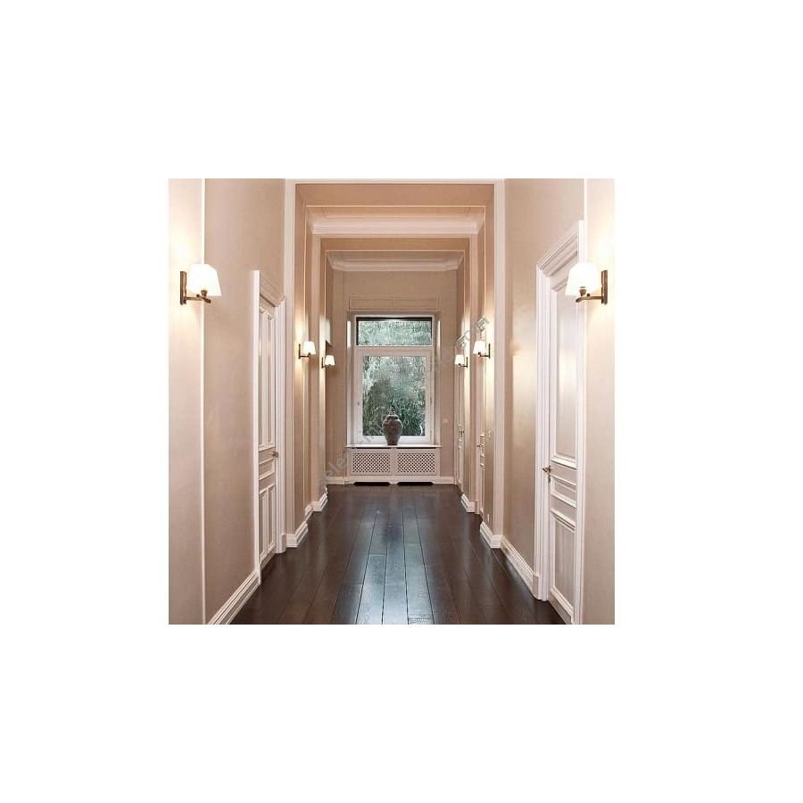 Large double wall light made in brass. Made with a fixed rectangular tube on a rectangular base. This wall light harmoniously decorates your interior. Available in black or matt gold patina. Presented lamp shade in white cotton chintz in a tapered cylindrical shape (see other available shapes and colours).