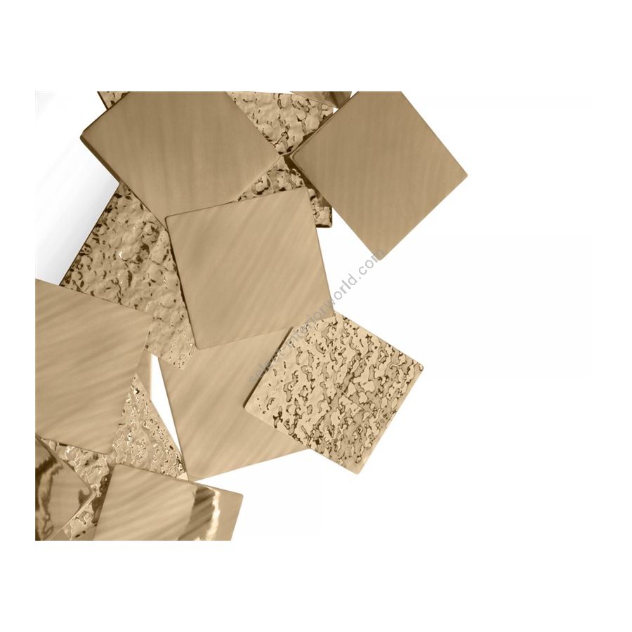 This unique bespoke decorative piece combines two different finishes – brushed and hammered – applied by hand in the gold plated brass. The reflection of light strives to convey balance through squared shapes that lead to a gentle diffusion, granting to the surrounding space the all-time perfect inviting ambiance.