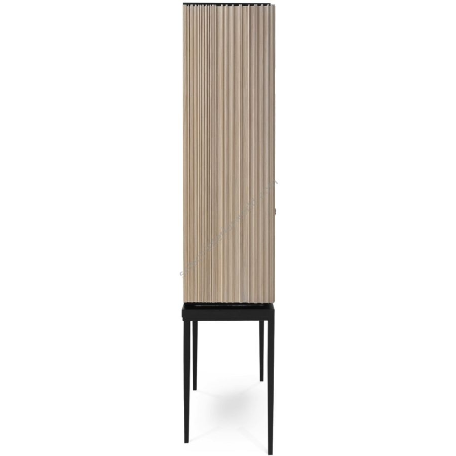 A sleek design with intricately carved reeded doors, accented by the CG signature knot, this tall bar cabinet features shelving for wine, spirits and stemware storage. The cabinet is perched atop metal 'stiletto' supports. Also available in a larger version (88-0010).
