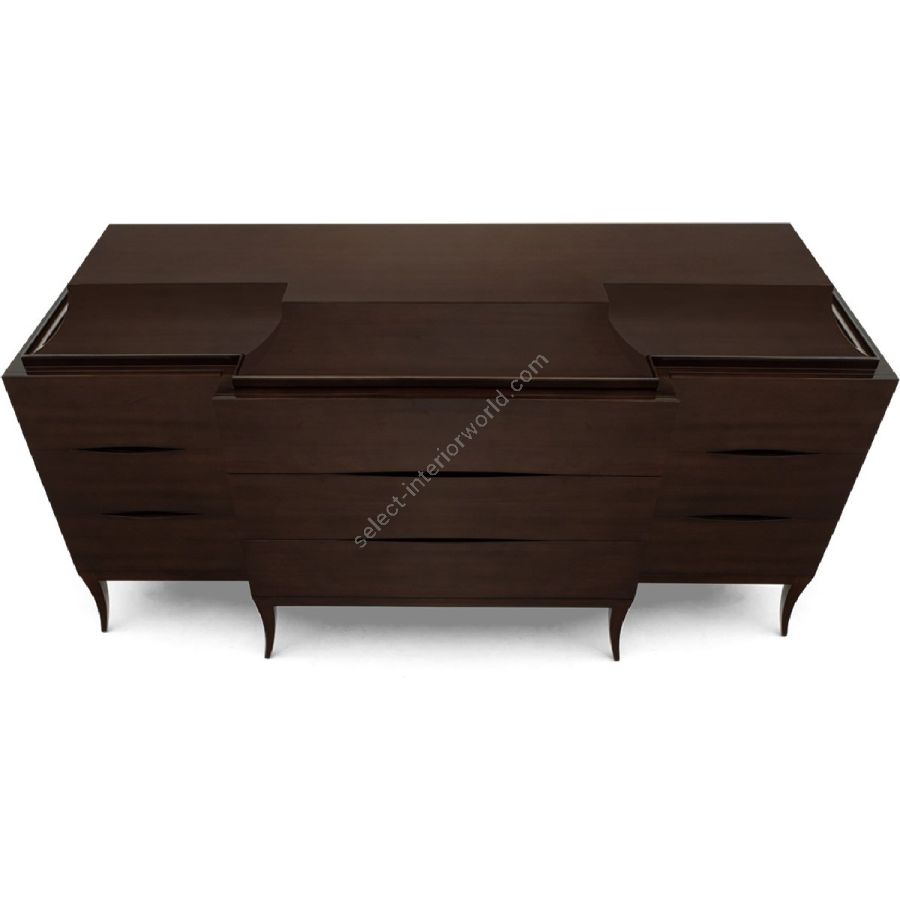 Handsomely hand carved from mahogany, this sleek cabinet is designed with two additional outer side doors with four-drawer chest, including one drawer concealed in the curved top section, also available in a single four-drawer chest version.