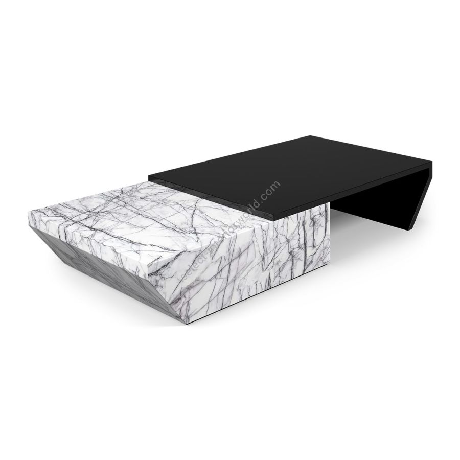 A striking interpretation of contemporary form, this marble coffee table explores the harmony between geometry and materiality. Its bold silhouette, defined by sleek architectural lines, transforms into a statement centerpiece in any living space. Offered in a selection of exquisite marble options, with the choice of a leather-lined exterior or a fully wood-finished version, it embodies both versatility and refined design.