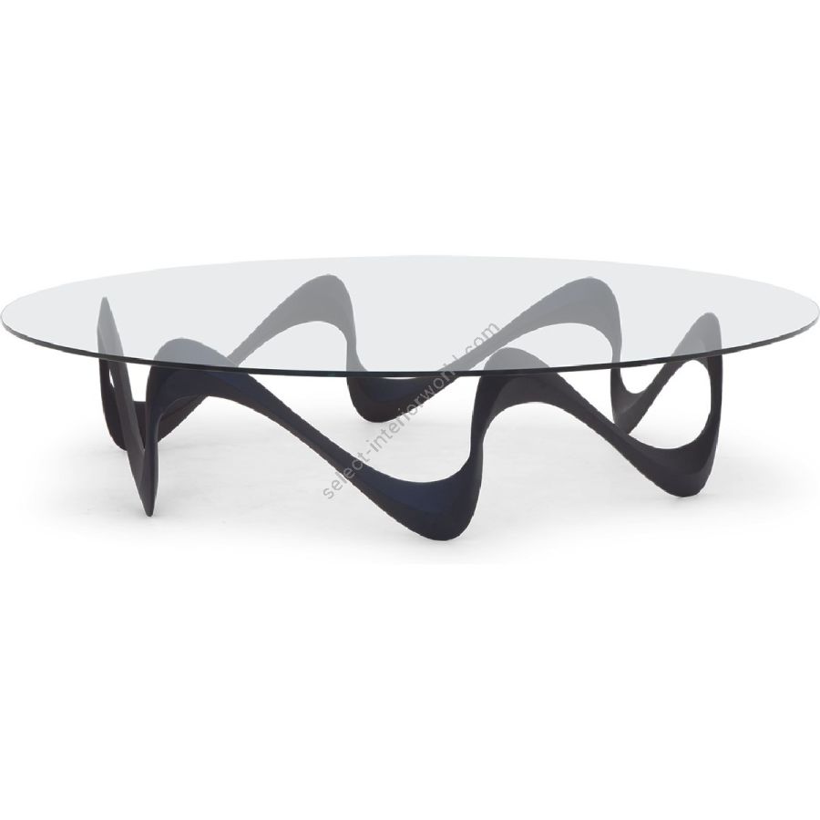 The dramatically alluring and sensuous curves of this coffee table’s hand-cast aluminium base supports a transparent circular tempered glass top.