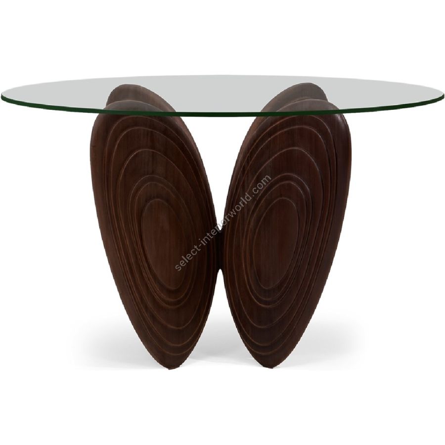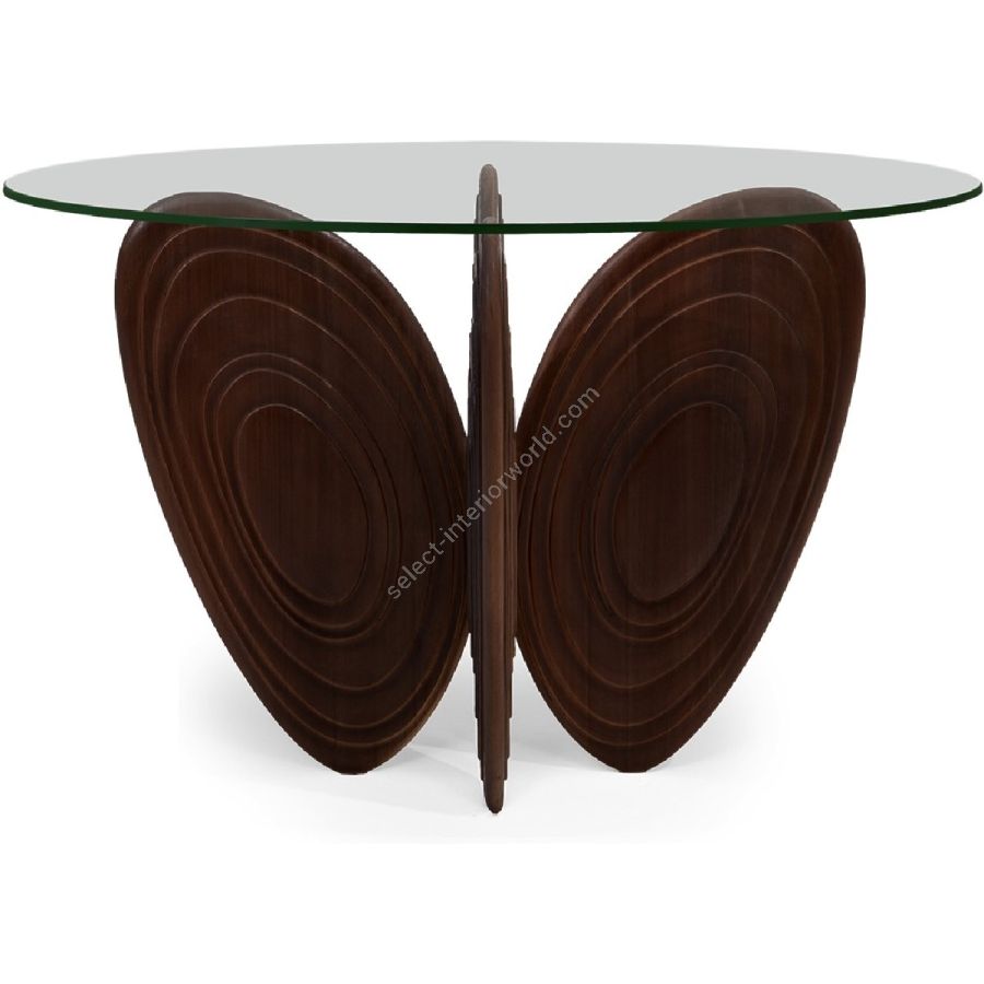 Designed to resemble a gossamer butterfly, this beautiful and highly original center or dining table seats 4-6 people. The four wooden ‘wings’ forming the base are exquisitely hand carved in concentric ellipses, and hold on their tips a round tempered glass top so delicately as to make it appear to float. A magical piece to enhance any style of setting.