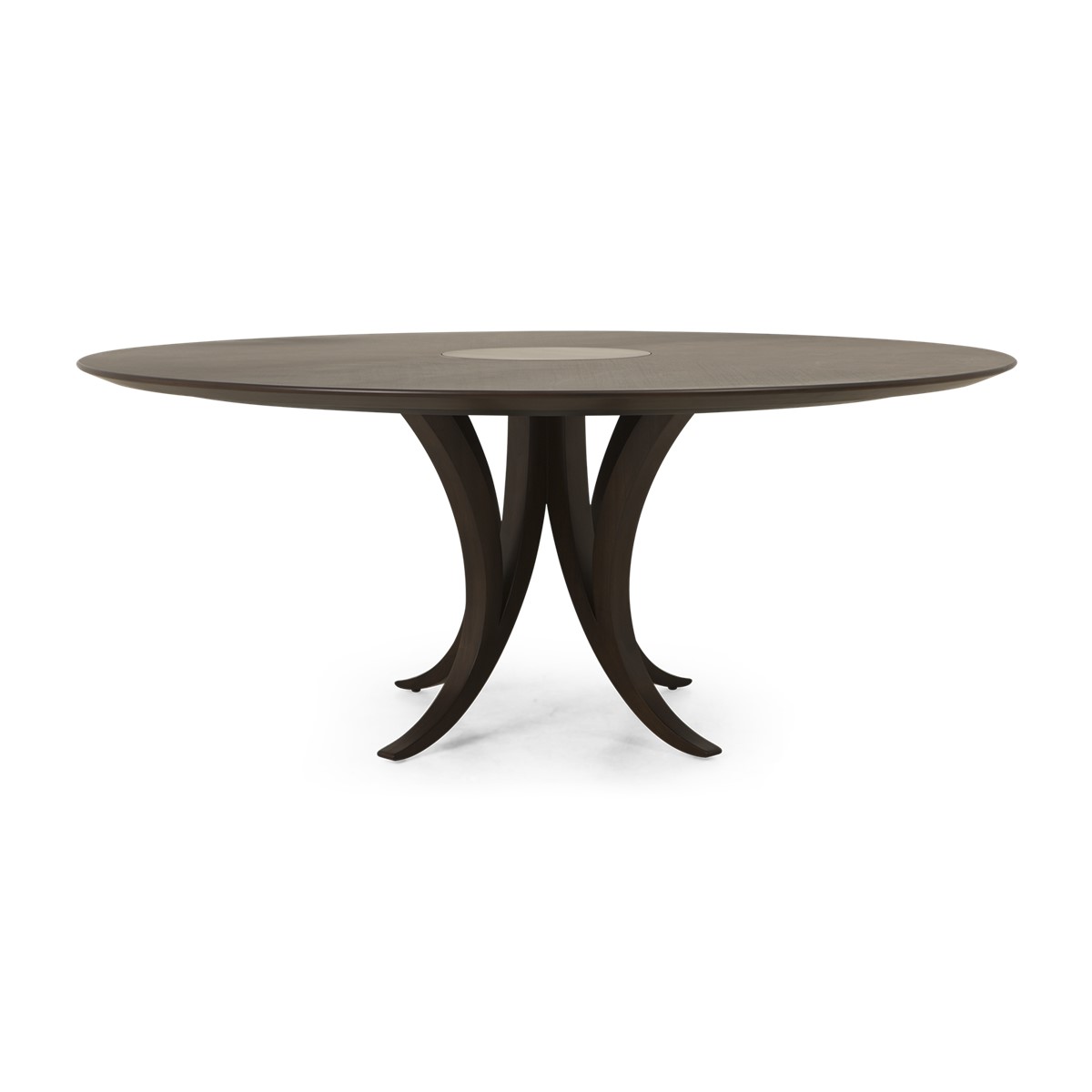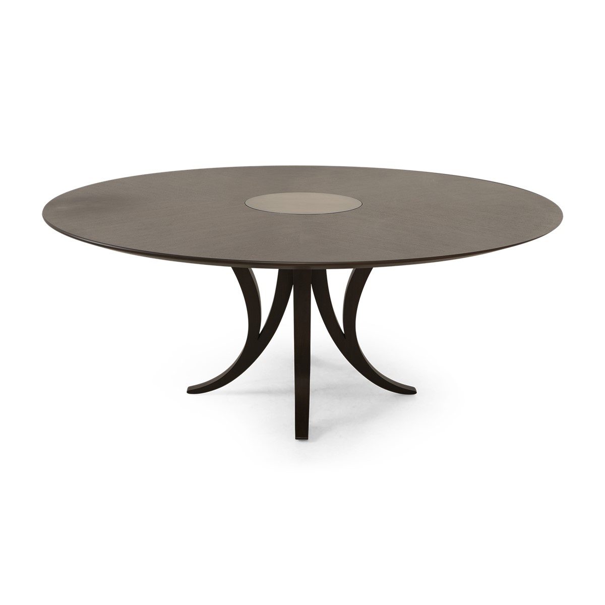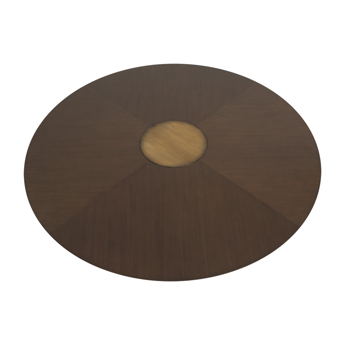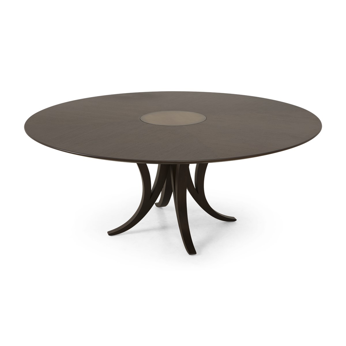 Exquisite round dining table supported by four curvaceous mahogany legs. The veneered top is further highlighted with a weathered flush mounted brass center-plate.