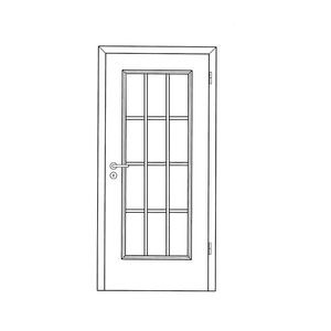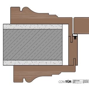 Mediterranean door with infill optics through milled V-joints in solid wood.