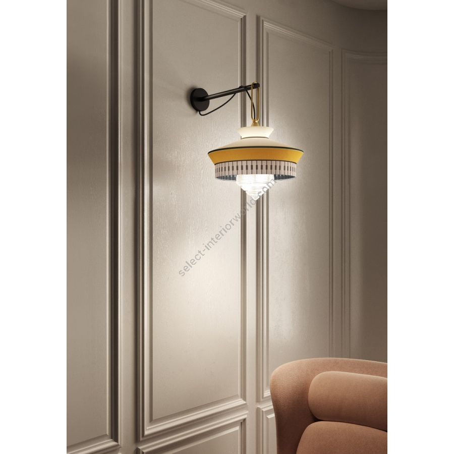 The wall lamp version is characterised by a thin and elegant arm with a matt silk black lacquered finish. It also has a satin brass ring that supports the lamp.