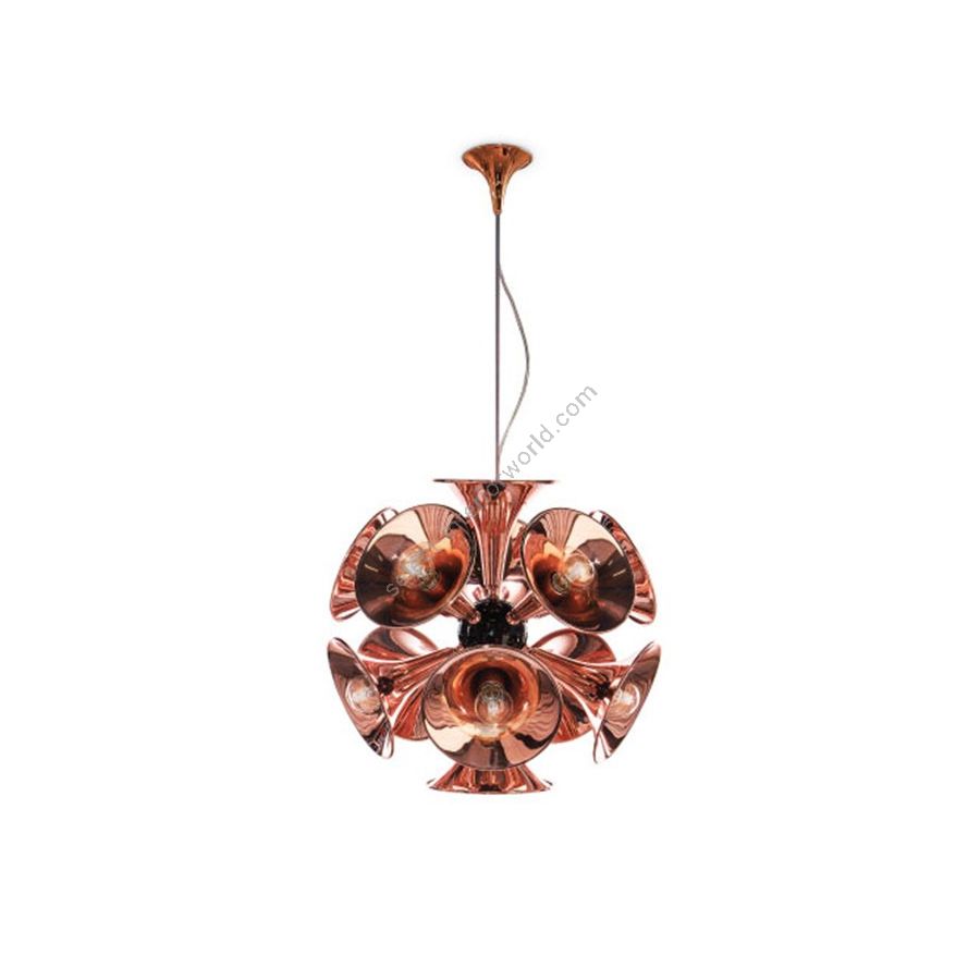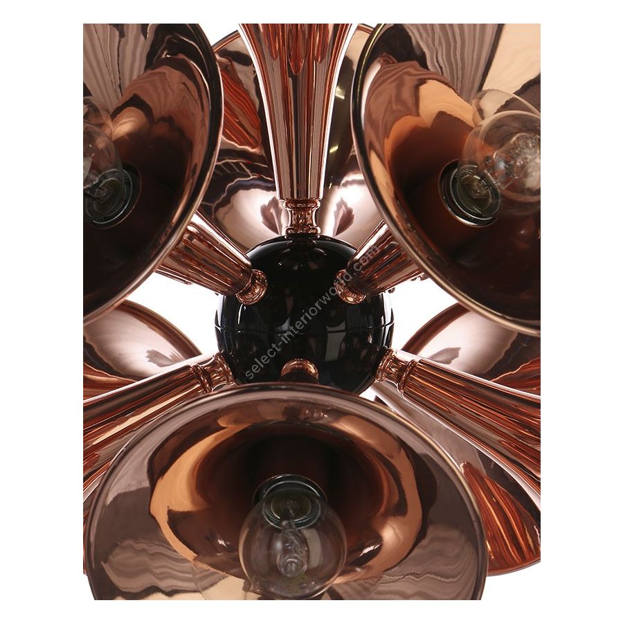 Inspired by the american trumpet player Chris Botti as a tribute to jazz music, Botti pendant lamp is a slightly smaller version of the modern chandelier with 15 trumpet-shaped shapes that stretch out from the center, creating a perfect sphere. It is handmade in brass, covered in a gold-plated finish. The round base at the center of the suspended light is handmade in aluminum and lacquered a glossy black, but it can also be lacquered a glossy white to meet the needs of the most exquisite sets. With a retro vibe, this art deco suspension lamp is best suited for a vintage living room, or mid-century modern bedroom.