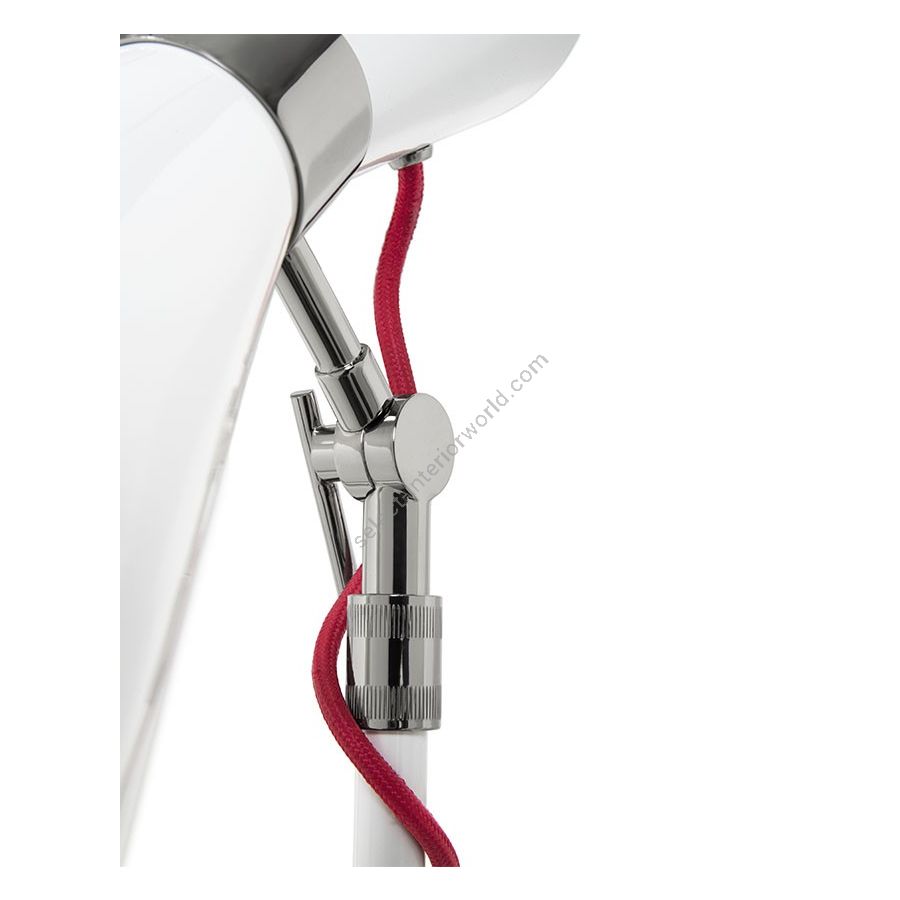 Simone wall lamp has a sleek, utilitarian design that brings a vintage flair to mid-century modern interiors. With a glossy white shade and a textile red wire, the vintage wall light fits in with a wide array of color schemes and styles. The three fully flexible arms are made of aluminum and the structure in brass, boasting three cone lampshades with gold plated accents. This mid-century modern sconce is easily changeable when in need of a reading light, especially as a bedside lamp, or if you are simply looking to light up your hallway.