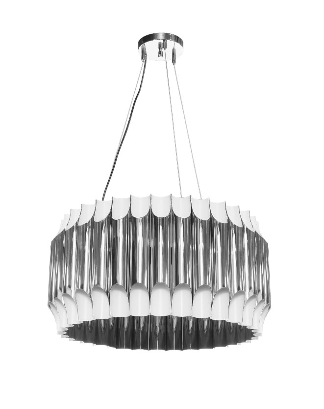 Galliano round chandelier is a mid-century modern light with a shape that was inspired by a pipe organ. With sculptural shapes and an extremely balanced design, this modern lighting design gets even more beautiful when you see the light being casted thought its pipes. It’s possible to customize this suspension lighting in any shape or dimension: round, oval, square or rectangular. Handmade in steel, the features include a nickel plated finish applied by some of the finest artisans in Portugal. The interior of the lamp shades are in white matte, enhancing the lighting design with a perfect mix of form and function. Ideal to use as a modern dining room lighting fixture or as an entrance lighting, Galliano has a mid-century modern appeal that won’t go unnoticed.