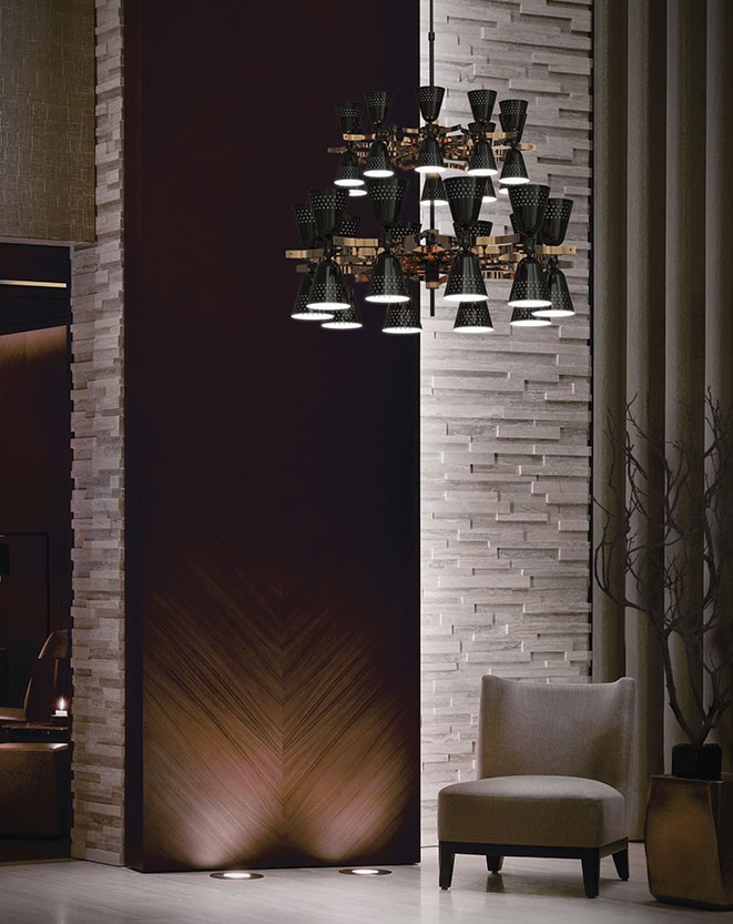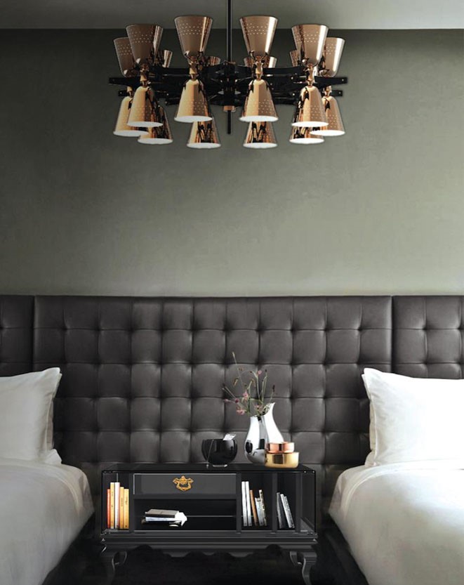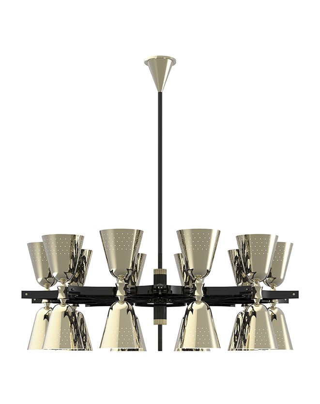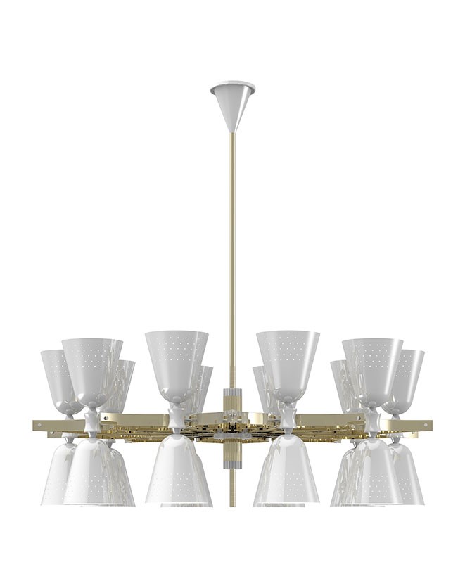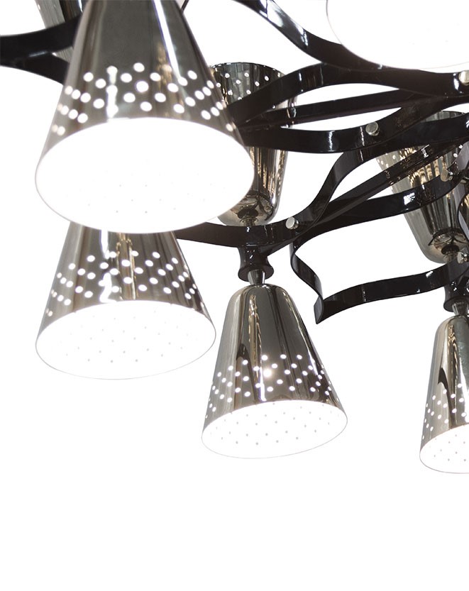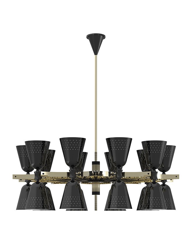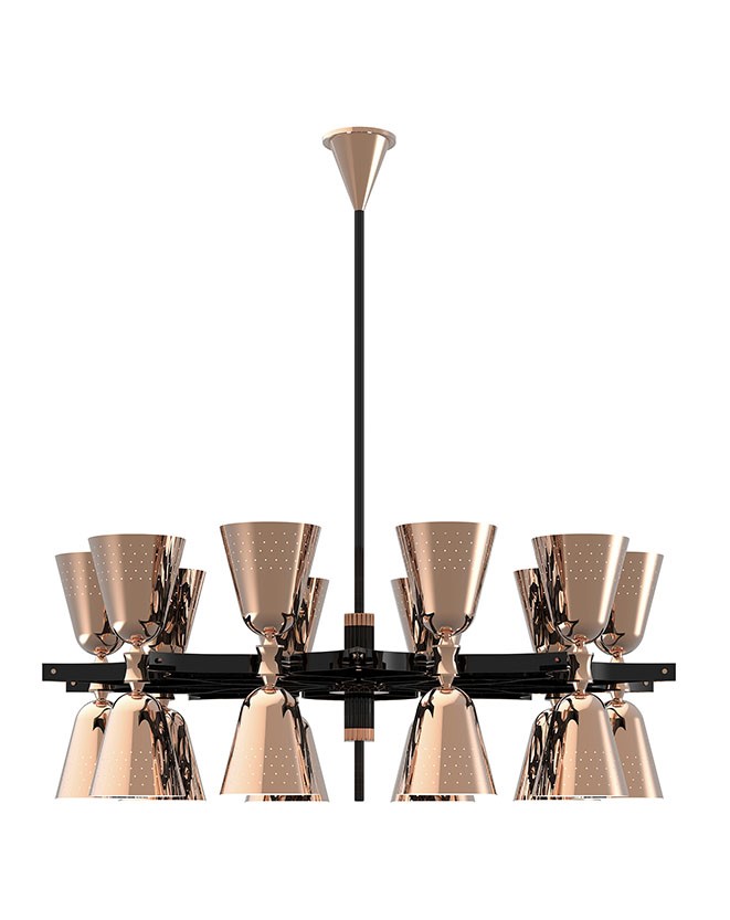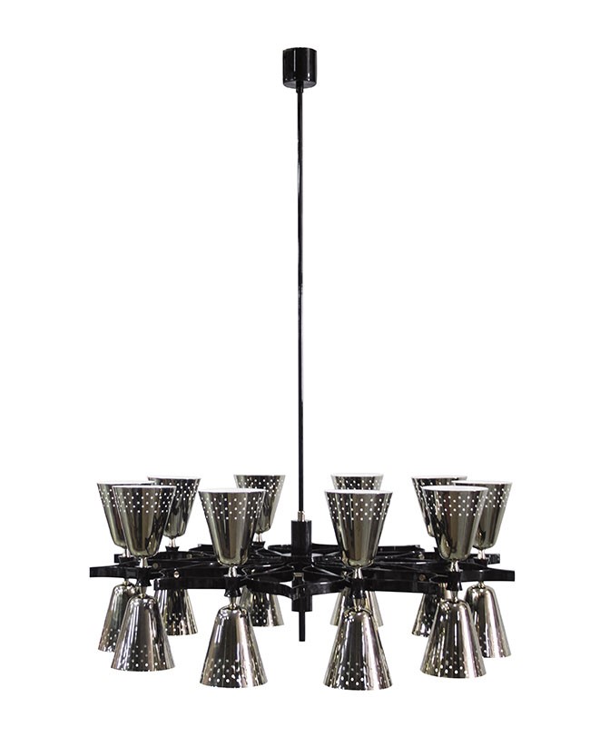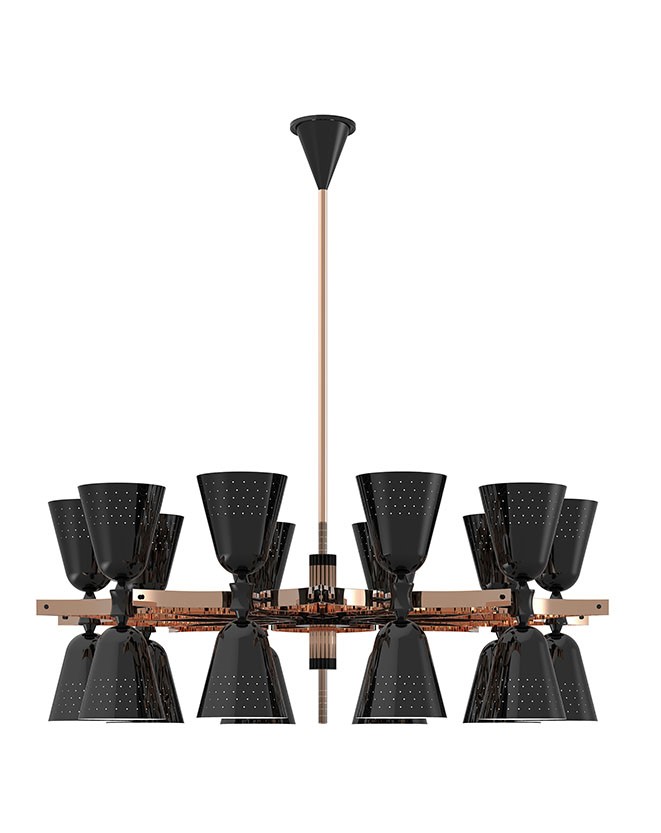 A revival of the mid-century modern design classics, Charles contemporary chandelier is a simple lighting design with a lot of character. It features 20 lampshades, all of them handmade in brass, with perforated details on the top. A copper plated finish is applied to the body of the lamp at the end of the process, creating a more contemporary vibe. The shades are lacquered a glossy black on the outside and a matte white on the inside, helping to create a more cozy light to the human eye. This copper pendant lighting can also be customized to have more shades, according to your needs. The right contemporary pendant light for a Scandinavian dining room, or a modern living room design.