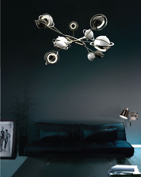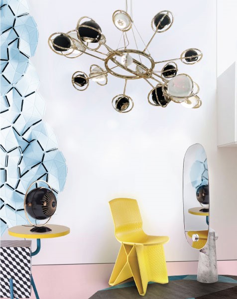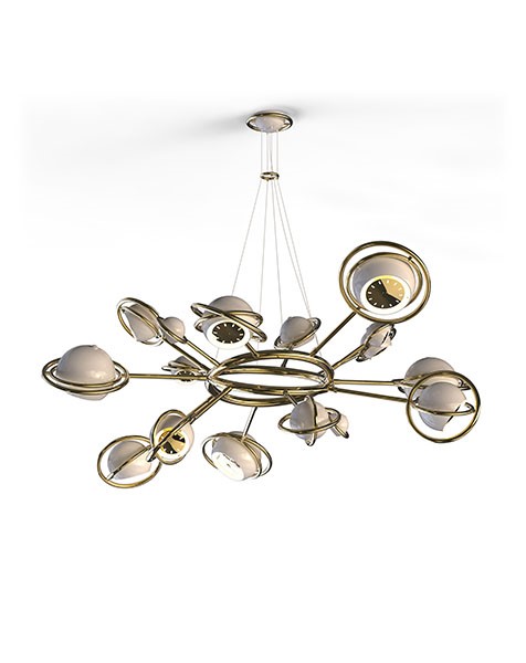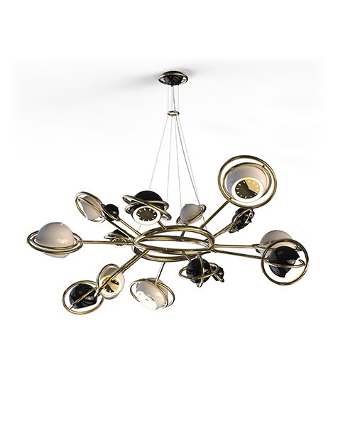 Designed as a tribute to the mid-20th century race to space, Cosmo modern chandelier is inspired by space, galaxies and the planets that surround us. It is a memorable lighting fixture, with very unique details that make it the luxurious bespoke design piece that it is. Handmade in brass and steel, the body is covered by a gold-plated finish, while the stainless steel shades are lacquered a glossy black and glossy white on the outside. It is an intricate design piece to put on display at the entrance of a modern hotel, or to use as a modern dining room lighting fixture.