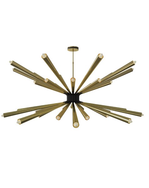 Inspired by the acclaimed jazz trumpet player Tommy Dorsey, this mid-century suspension chandelier is a unique lighting fixture that embodies the musicality of the 1950s. Allying the best of ancient techniques with the modern expertise of high- craftsmanship, Dorsey is a handmade brass chandelier, with aluminum lamp shades. The telescopic tubes that make up the body boast a gold-plated finish, while the lamp shades and center are lacquered a matte black. It is a unique chandelier, perfect for a mid-century hotel lobby, or an art deco-inspired restaurant. It can also be used in private residences, especially as a dining room lighting fixture.