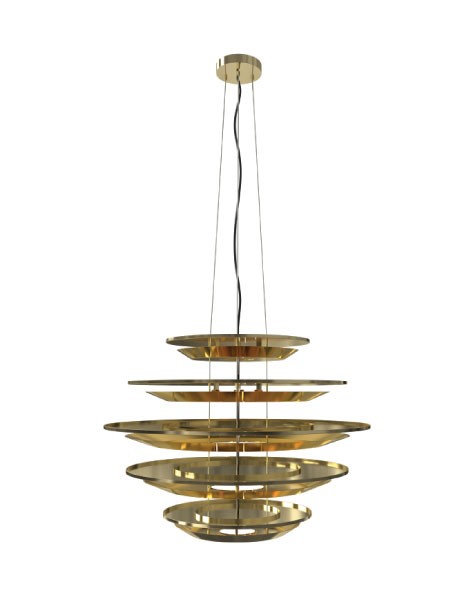 Inspired by the millions of vinyl records sold by the famous american guitarist, DelightFULL has created this elegant gold plated luminaire. Proof that high-quality craftsmanship and ancient know-how can create stunning lighting fixtures, Hendrix suspension chandelier has come to revolutionize the mid-century lighting design world. Its simple geometry was designed to ensure that all the five gold-plated brass tiers are struck by the rays of light in the same angle, creating a glare free illumination. The light is pushed downward in the funnel, where it is then dispersed, leaving a soft glow directly under it at the same time it bounces back some of the lighting power upward on the dome. This ensures the creation of a warm and cozy atmosphere, perfect for a mid-century living room decor, or even a more contemporary entryway.