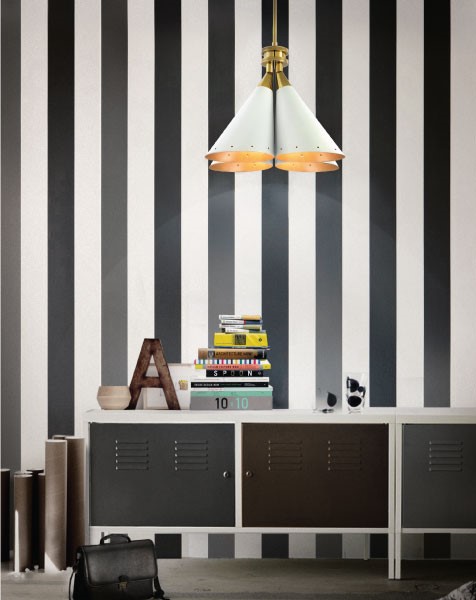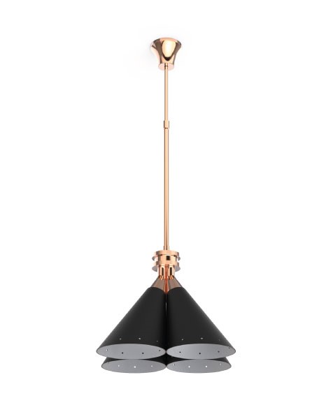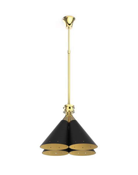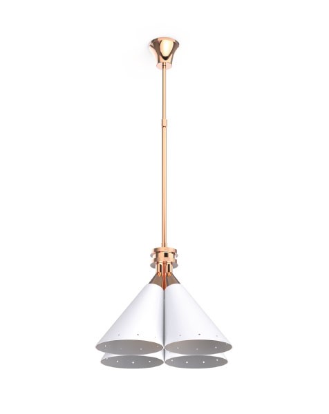 Inspired by a flower bouquet, DelightFULL’s designers designed Madeleine, an industrial pendant lighting. With four cone swiveling pinhole lights, this brass pendant lamp features a matte white interior and a gold powder paint inside finishing. This white pendant light is also possible to have with a flexible drawbar so that you can move it anytime. Madeleine is 15,5 inches tall, but it can be customizable on purchase, going up to 39,4 inches. Madeleine can complement many lofts, bars and restaurants, however this pendant light can go anywhere, adding an industrial style touch to whatever room you decide to hang it in.