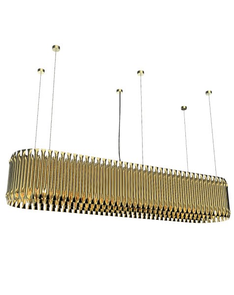 Feel the true statement of luxury with this modern suspension lamp. Matheny is a unique chandelier, a new take on the mid-century classics. It has a geometric design of combined tubes and its structure is handmade in brass. Its shape is round and is composed by golden tubes, which reflect the sophistication of a timeless iconic lamp. With 110 pounds, this luxurious chandelier light can be used in a modern living room or as a modern dining room lighting. All in all, Matheny round chandelier will certainly capture the attention of your guests.