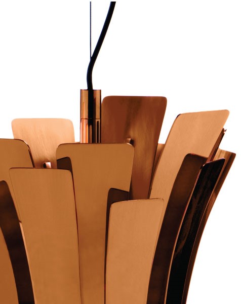 Etta pendant lamp boasts a nostalgic and feminine retro glow, courtesy of the jazz singer Etta jones, which was the inspiration for this curvy lighting fixture. Etta is a luxurious pendant light with 20 different brass leaves, which are all shaped and assembled by hand by DelightFULL’s skilled artisans. Etta’s standard copper plated finish helps to provide a soft and warm light, that is cast through its layers, giving a romantic ambiance to any setting. Nevertheless, keep in mind that this mid-century suspended light can be customized according to your needs and requests. It is the ideal copper pendant lamp for a sophisticated kitchen design, but it can also be used as a suspended bedside lamp.