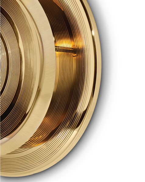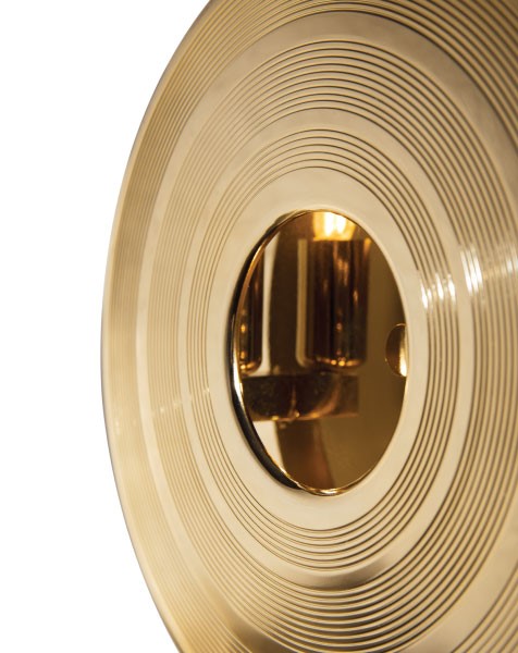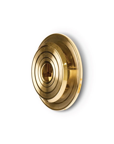 Hendrix wall sconce has a round shape that was inspired by a golden vinyl player. Ideal for every single mid-century modern interior, this wall light fixture will bring a smooth lighting effect to your room. 100% handmade in brass, Hendrix showcases a high quality craftsmanship. With a gold plated finish, this wall light has an avant-garde design perfect for modern and contemporary environments. These three symmetric light sources cast a perfect caustic phenomena reflected that gives life to any living room decor, restaurant and bar.